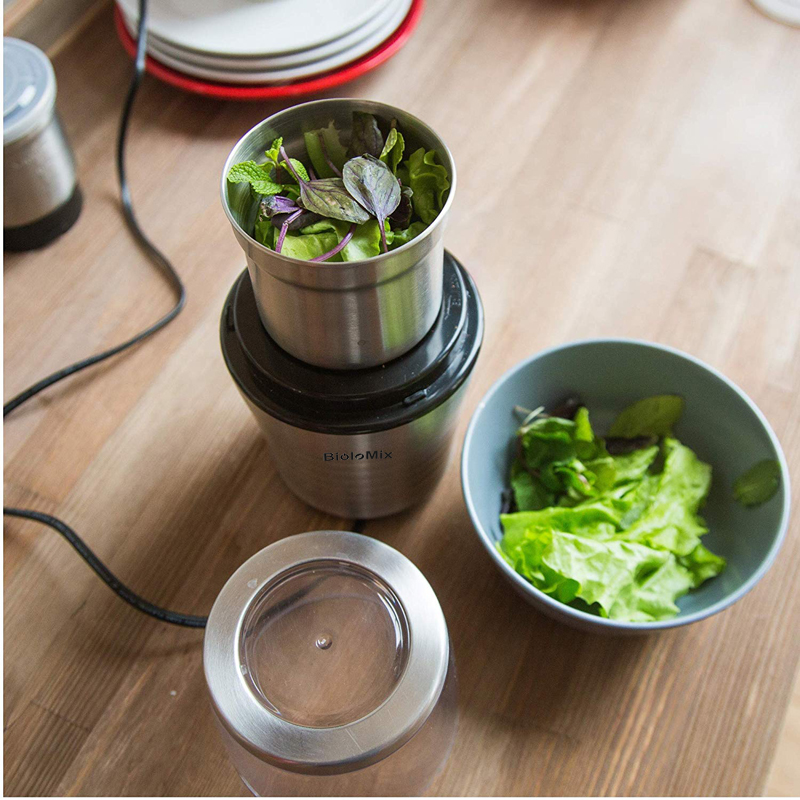 BioloMix 2-in-1 Grinder come with two removable cups for grinding dry food and chopping wet food.