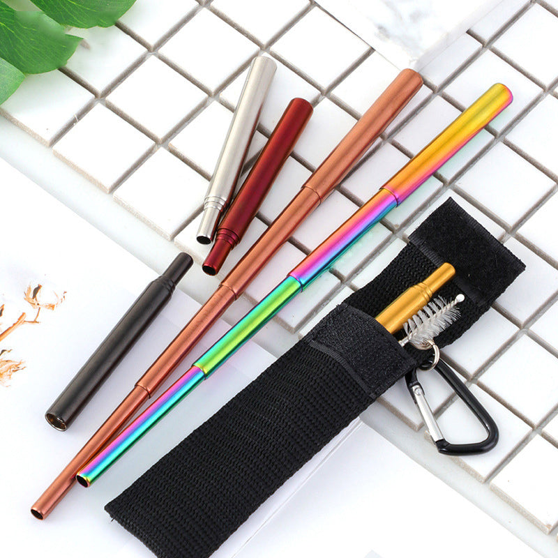 2 Sets of Telescopic Straw Reusable Stainless Steel & Cleaning Brush & Storage Bag Silvery