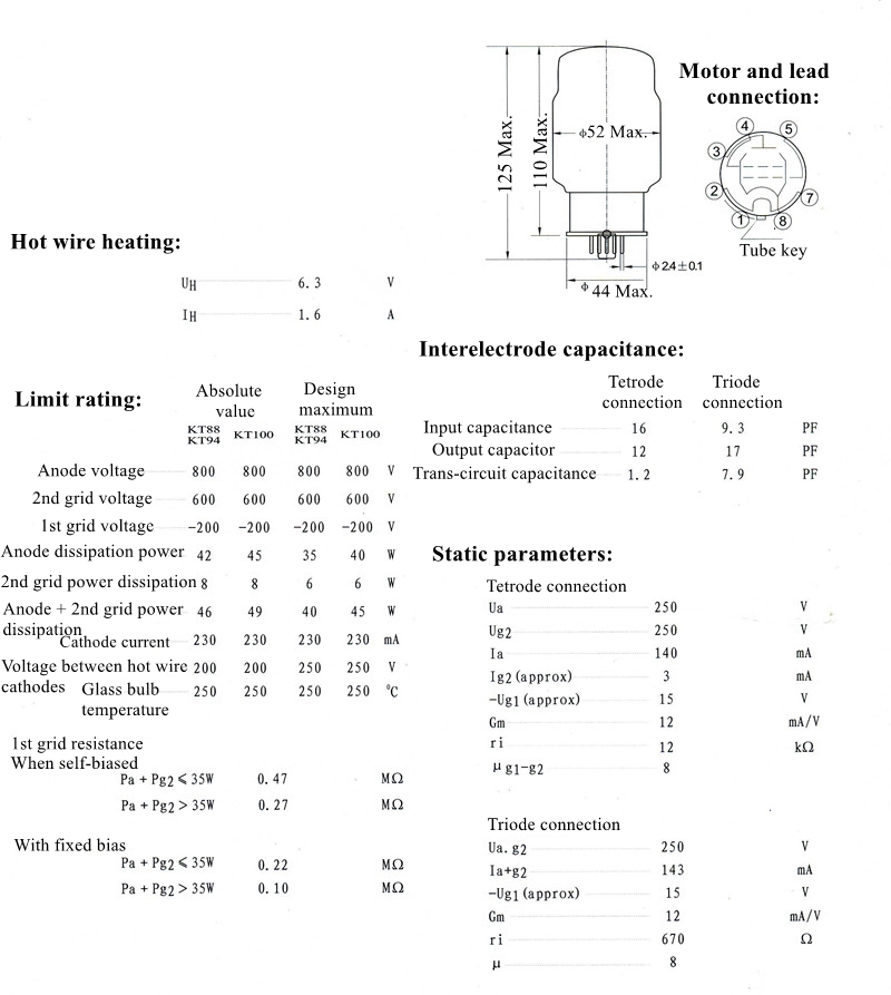 The anode limit dissipation power of the beam power tetrode KT88 is 42W. In an audio amplifier, 100W can be obtained when the two tubes are used as AB1 push-pull output. At the same time, KT88 can also be used in electronic voltage regulator circuits. KT88 is similar to CV5220 and 6550 and can be used interchangeably.