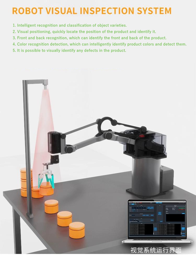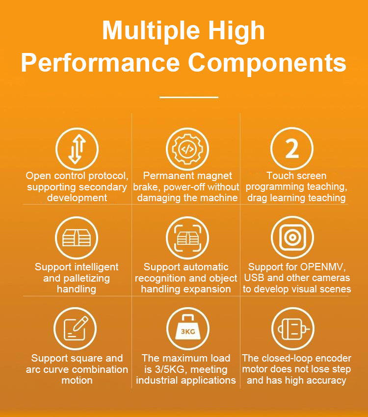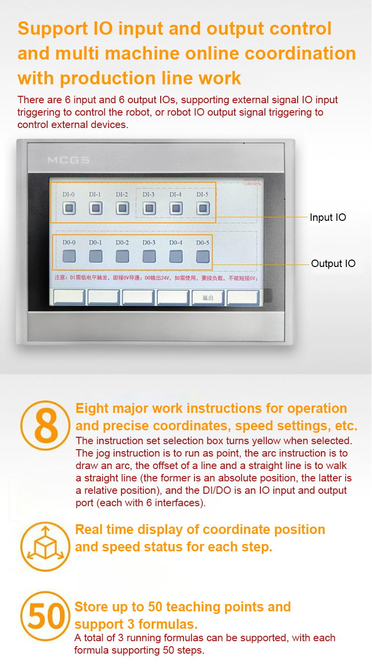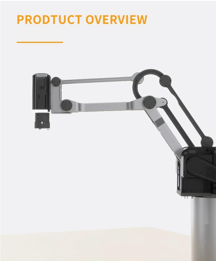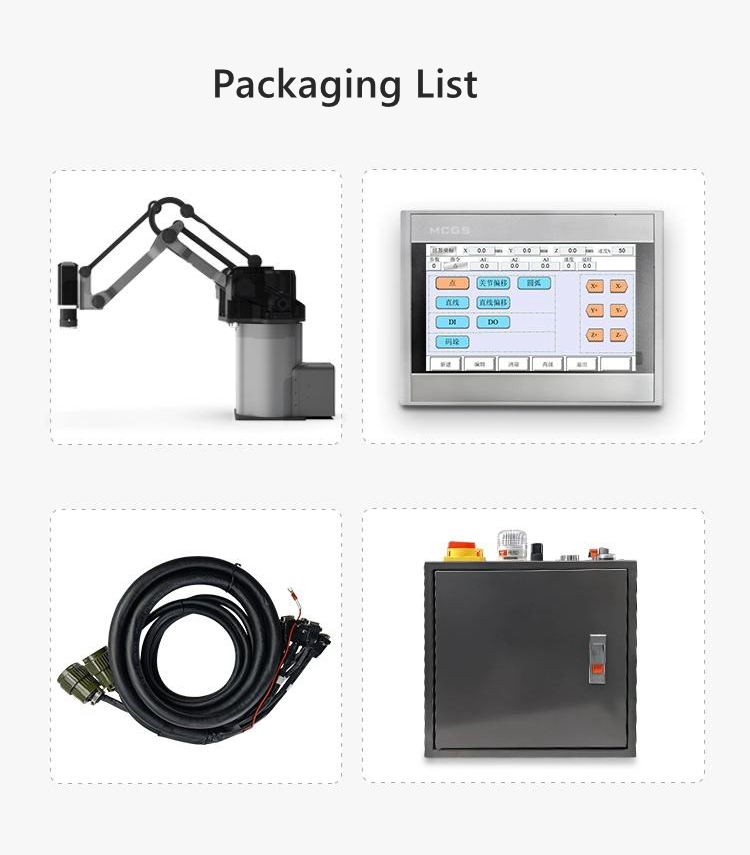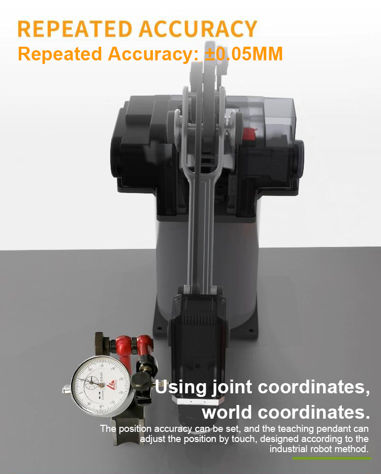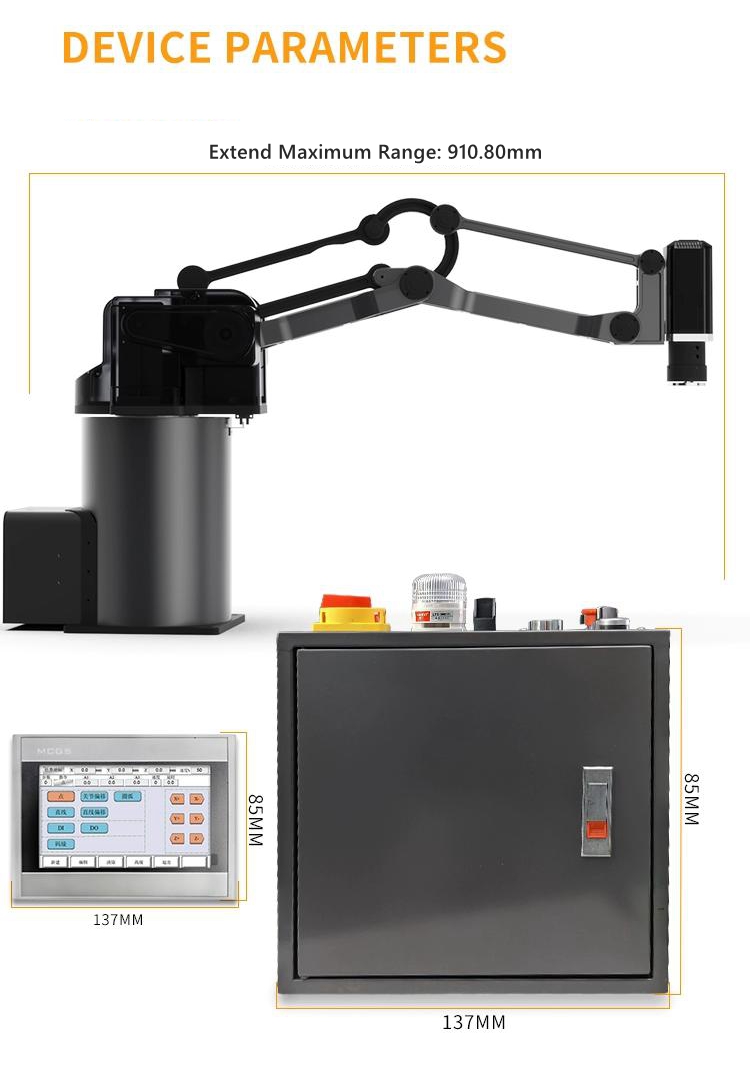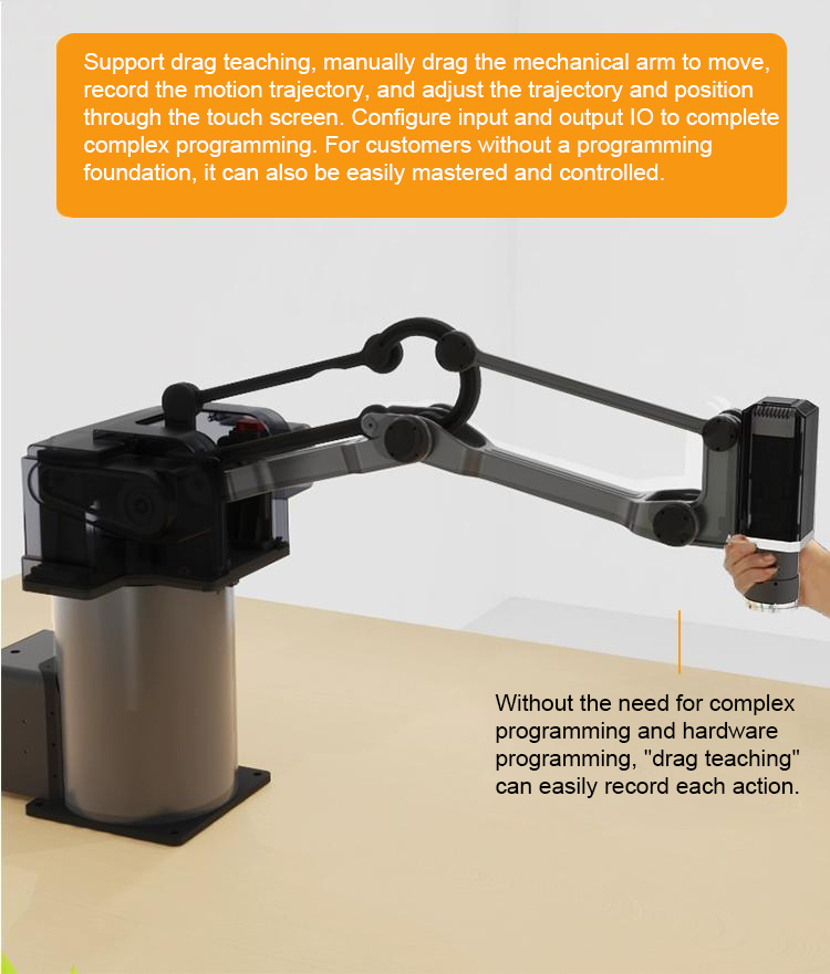 - This mechanical arm is also equipped with an operation teaching device, which is simple to operate and fast for beginners. The teaching device supports jog teaching and drag teaching. Supports three major user formulas and three independent programs, with a programmable number of 50 points per program. The maximum load of the mechanical arm can reach 5KG.