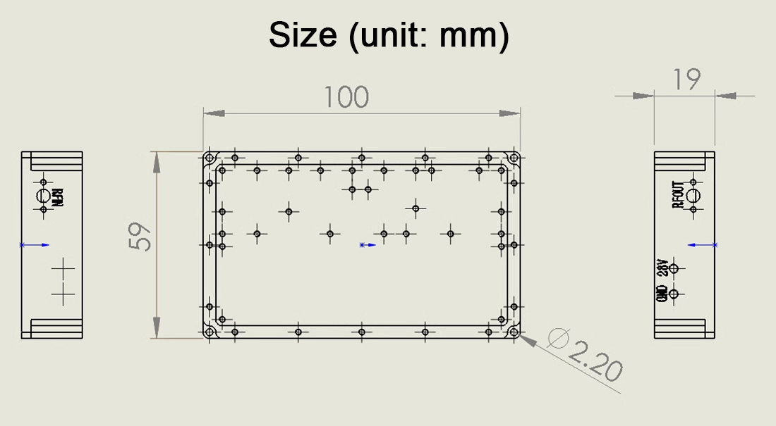 The RF power amplifier is powered by 28V (32V), with a static current of 130mA and a working current range of 0.6A to 1.2A. The module is compact in size, with a wide operating frequency range covering U/V/L/S bands. The full-band flatness is good. In the full frequency band of 30M-3000M, the output power is greater than 10W. When the working voltage is 32V, the output power can reach 12W. This module can be used as an output amplifier for signal sources, EMC testing, and output power interference amplifier for drones. It can also be used as a driver stage for ultra-wideband high-power amplifiers. We provide the size diagram of the module. The module can be used directly as a system module or as a verification platform.