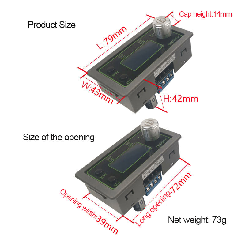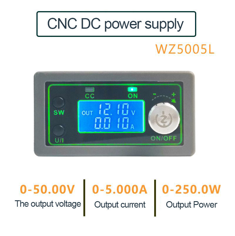 2. CNC adjustment, precise and fast, step-down output, output voltage 0-50.00V arbitrary adjustment, limit current 0-5.000A arbitrary adjustment.