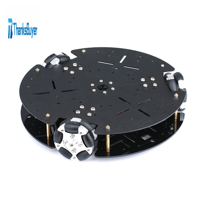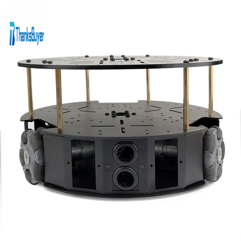 The three-wheel drive omnidirectional wheel platform uses omni wheels to achieve omnidirectional movement, including longitudinal movement and lateral movement. It is a double-tier platform, users can increase the number of tiers freely, providing more space. For example, you can install electronic devices such as controllers, sensors, cameras, etc. Suitable for DIY. This is a very good omni wheel learning chassis.