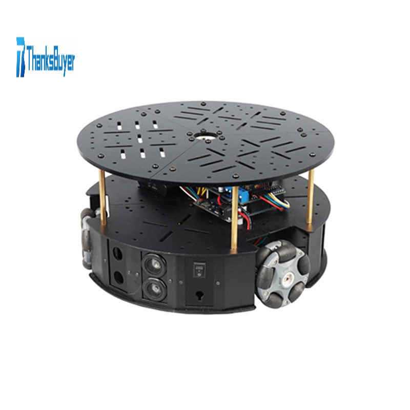 The three-wheel drive omnidirectional wheel platform uses omni wheels to achieve omnidirectional movement, including longitudinal movement and lateral movement. It is a double-tier platform, users can increase the number of tiers freely, providing more space. For example, you can install electronic devices such as controllers, sensors, cameras, etc. Suitable for DIY. This is a very good omni wheel learning chassis.