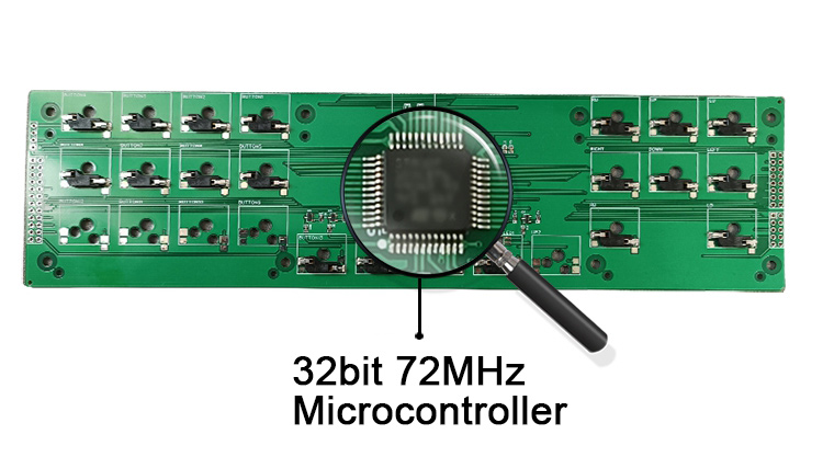 * 32-bit main control chip: The microcontroller's processor speed is 72 MHz. The keyboard state is queried 2000 times per second, with no frame drops. The keyboard state is transmitted to the computer within 1 millisecond, with no delay. Each key has its own physical and logical channel, ensuring no conflicts.