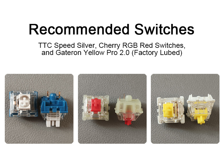* Recommended switches: TTC Speed Silver, Cherry RGB red switches, and Gateron yellow Pro 2.0 (factory lubed)