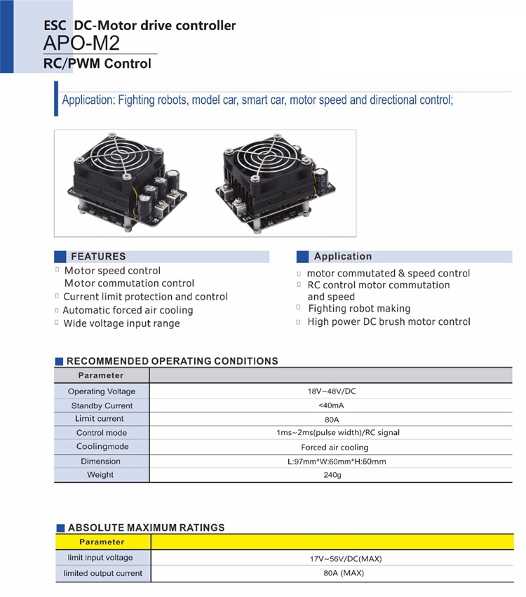 80A 18V-48V PWM DC Motor Controller 4000W RC ESC for Fighter Robot Motor Governor APO-M2