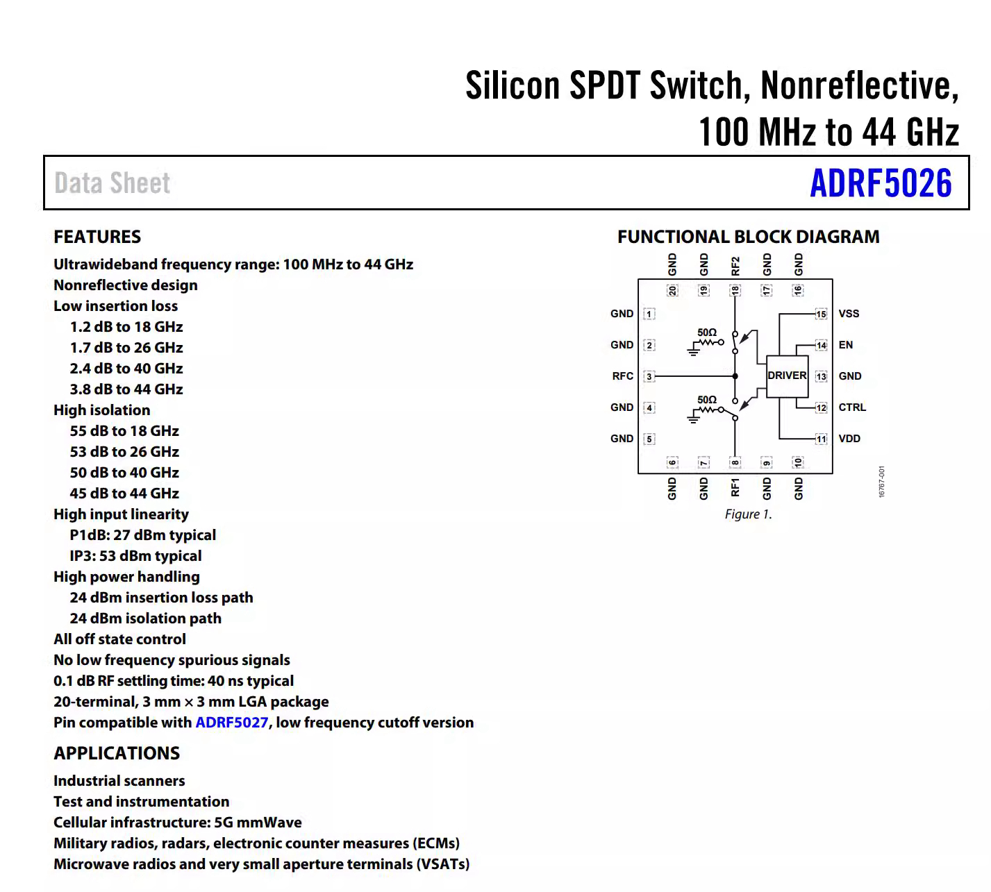 ADRF5026 operate from 100MHz to 44GHz. It has a better than 3.8dB insertion loss and 45dB isolation. ADRF5026 with full shutdown control and both RF ports are isolated. ADRF5026 is non-reflective, with both RF ports internally terminated to 50Ω.