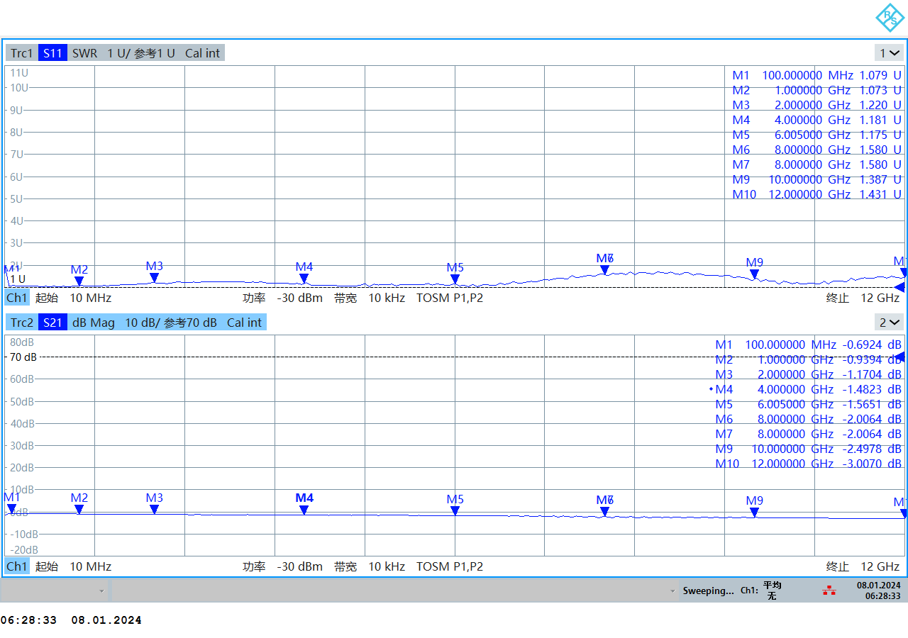 ADRF5026 RF ports are designed to match the characteristic impedance of 50Ω. For UWB products, impedance matching on the RF transmit line can further optimize high-frequency insertion loss and loop loss characteristics. For an example of a matching circuit that achieves a flat 2.4dB insertion loss response in the range of 28GHz to 43GHz, see the "Narrow Band Impedance Matching" section.