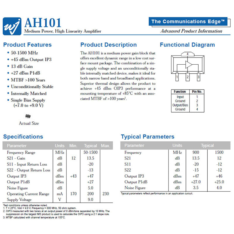 The AH101 is a medium power gain block that offers excellent dynamic range in a low cost surface mount package, The combination of a single supply voltage and an unconditionally stable internally matched device, makes it ideal for both narrow band and broadband applications. Superior thermal design allows the product to achieve +45 dBm OIP3 performance at a mounting temperature of +85℃ with an associated MTBF of >100 years³.