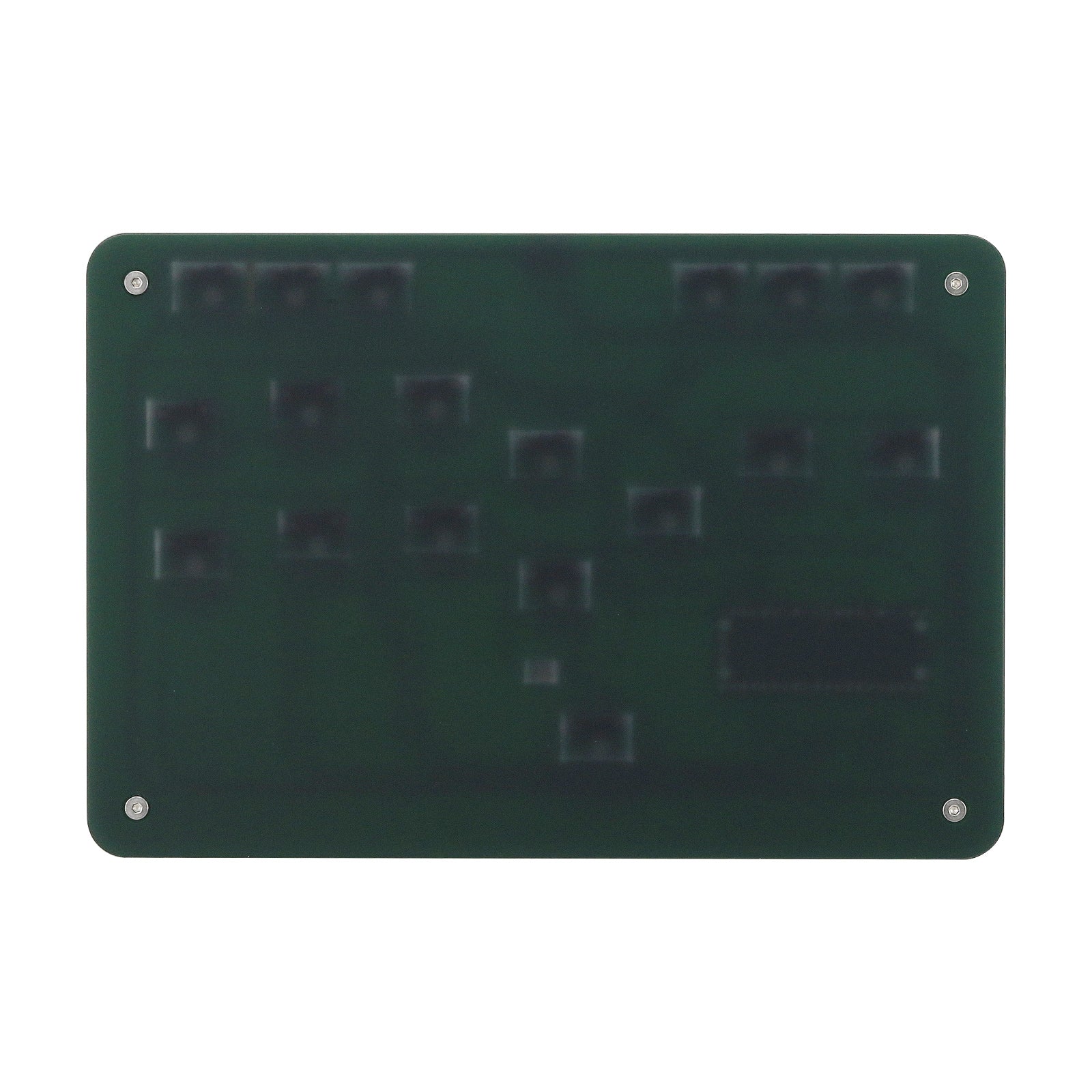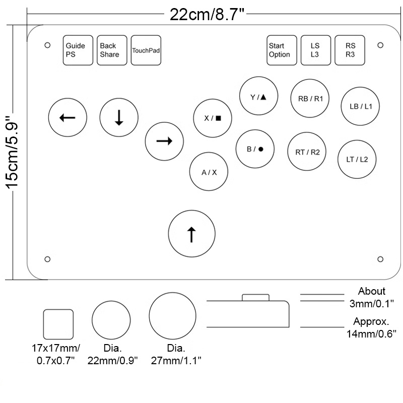 - Overall thickness is about 1.7cm/0.7" (including buttons). The key caps are approximately 3mm/0.1" above the panel. Weight is about 500g/1.1lb.