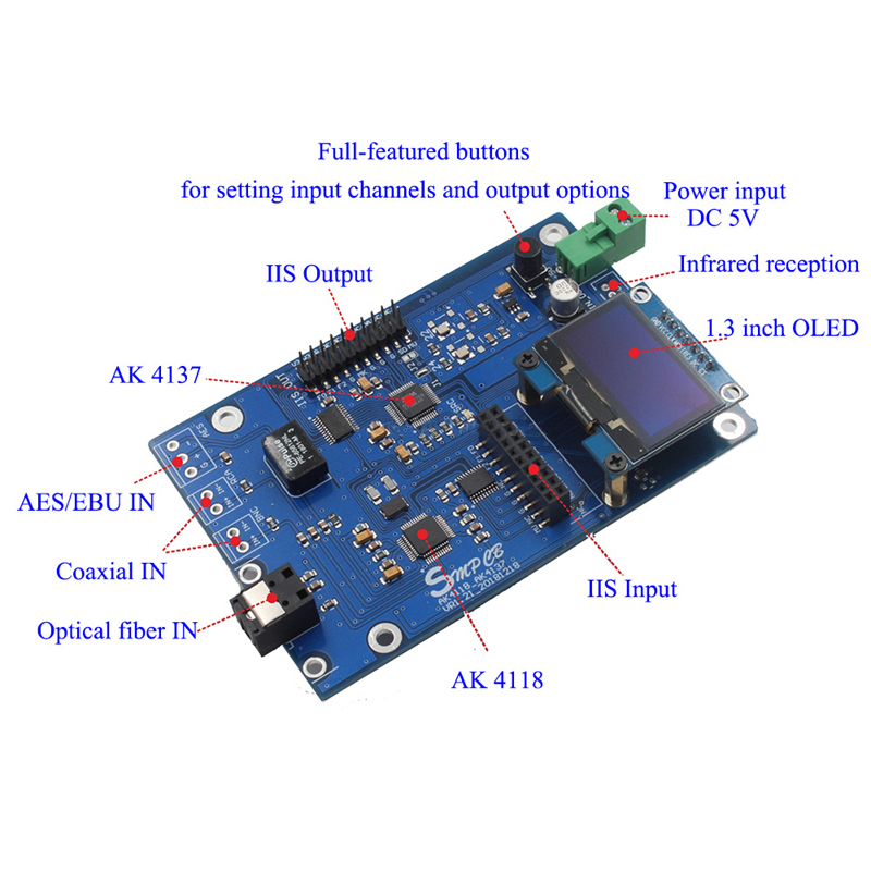 This product uses advanced chip AK4137EQ as the core. The chip supports 32bit 786K, DSD256 input, asynchronous up-conversion, and can be set to output multiple different PCM and DSD formats. Using AK4118 as the coaxial signal receiver, it has the lowest Jitter in the industry. Through the comprehensive optimization of MCU soft control, the performance is much higher than that of WM8805, DIR9001, CS8416 and other programs.