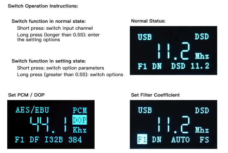 - DOP: When the DOP function is turned on, it supports DOP DSD64 signal adjustment to DSD64 output.
