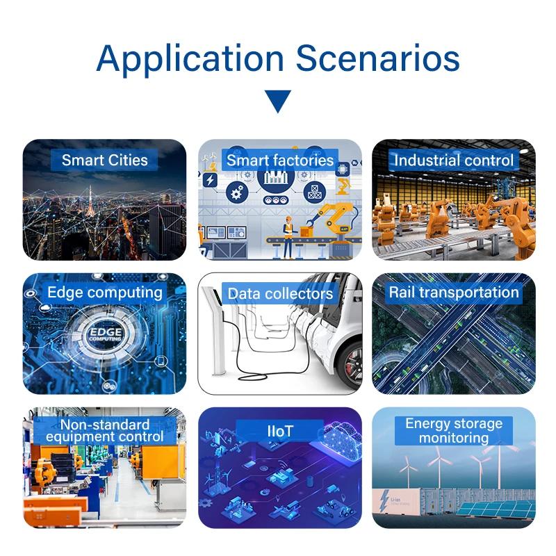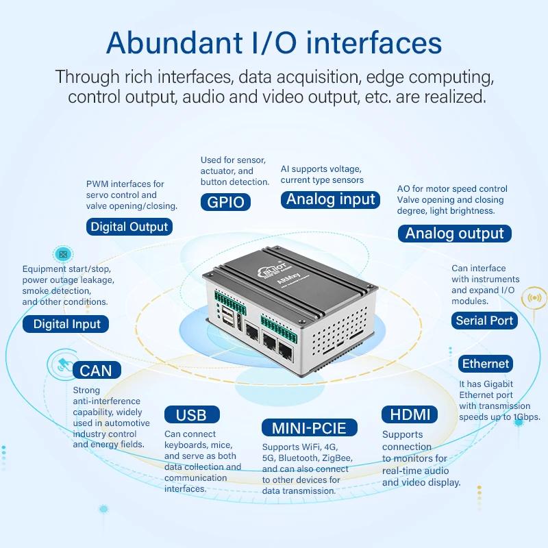- Interface: 3 x Ethernet port, 2 x USB port, 1 x HDMI-compatible port, 2 x RS485 port, 2 x CAN port, 8 x DI port, 8 x DO port, 4 x AI port; These interfaces support various functions such as communication, PWM output, pulse counting, and data acquisition and control. It also supports hardware decoding of 4K at 30fps videos.