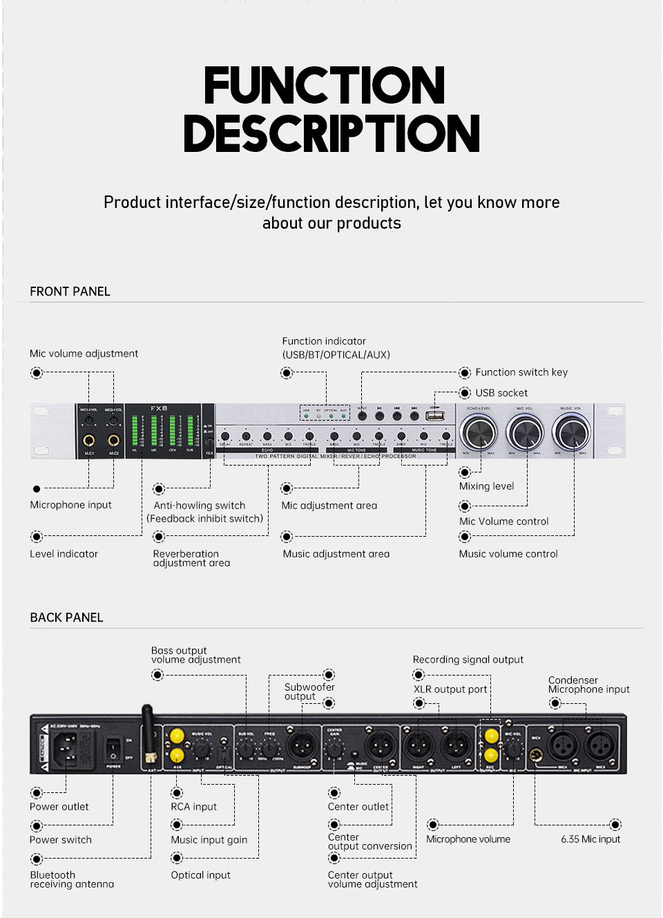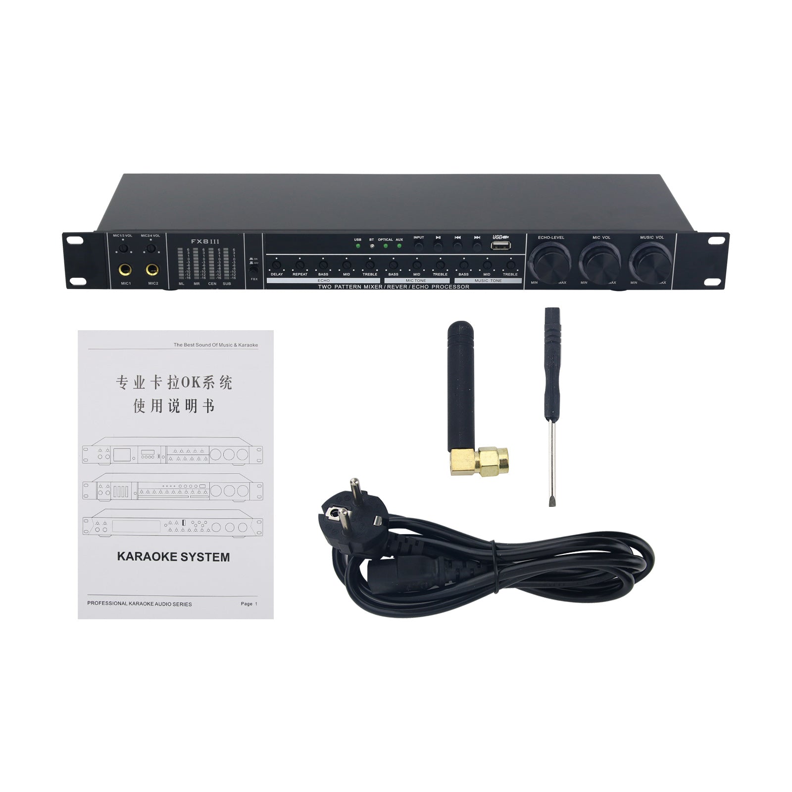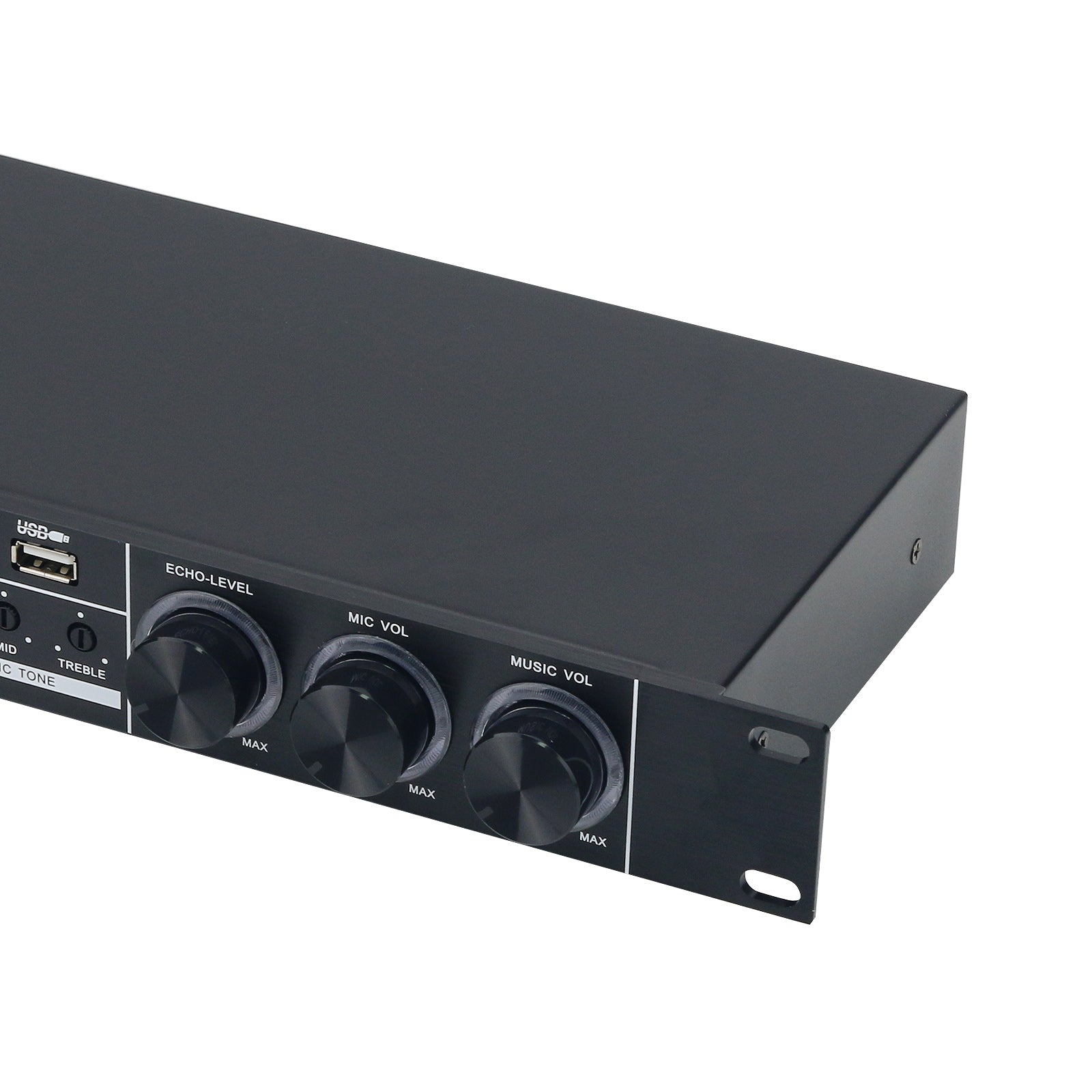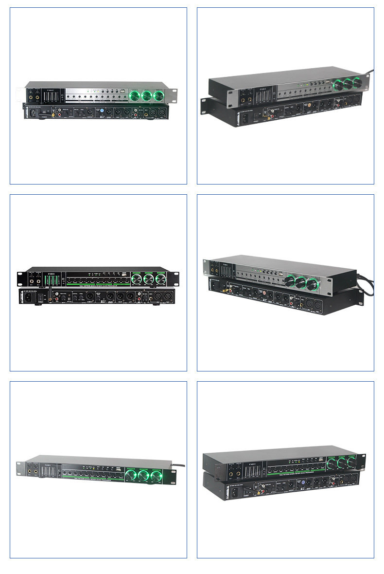 - The preamplifier is a karaoke effector with Bluetooth transmission and optical fiber digital audio transmission functions, and has USB playback function. A variety of transmission modes are integrated, and the transmission mode is switched by one button. The reverberation, music, microphone, treble, alto and bass pitch can be adjusted independently, and it is easy to operate.