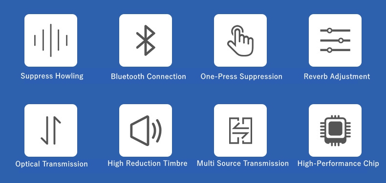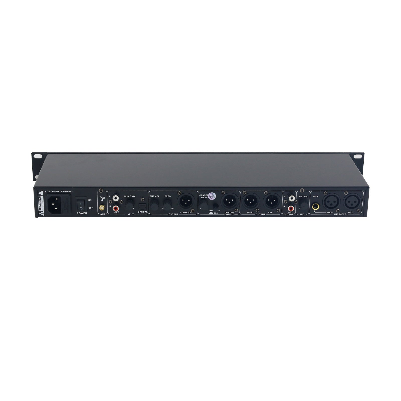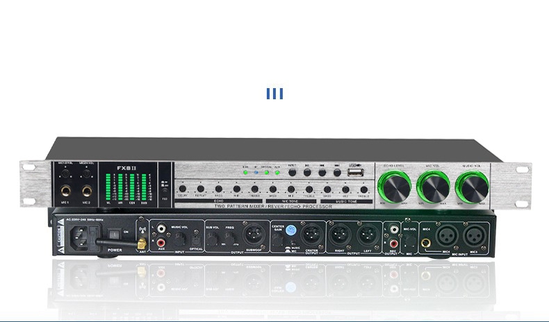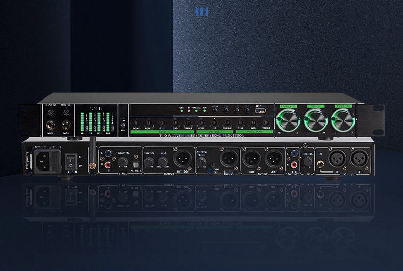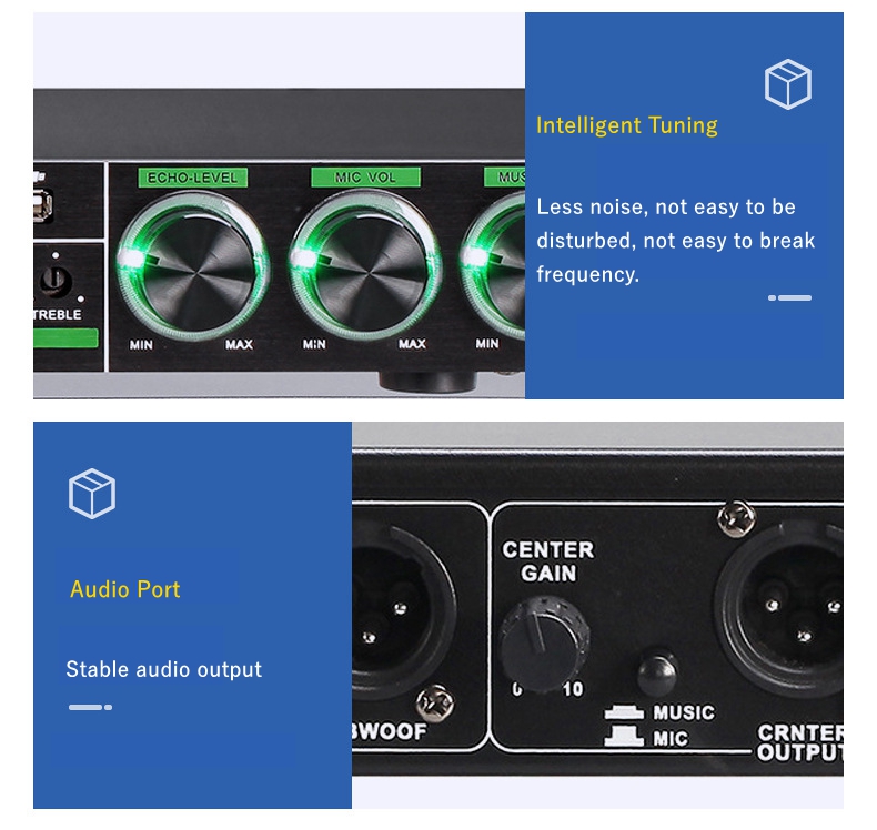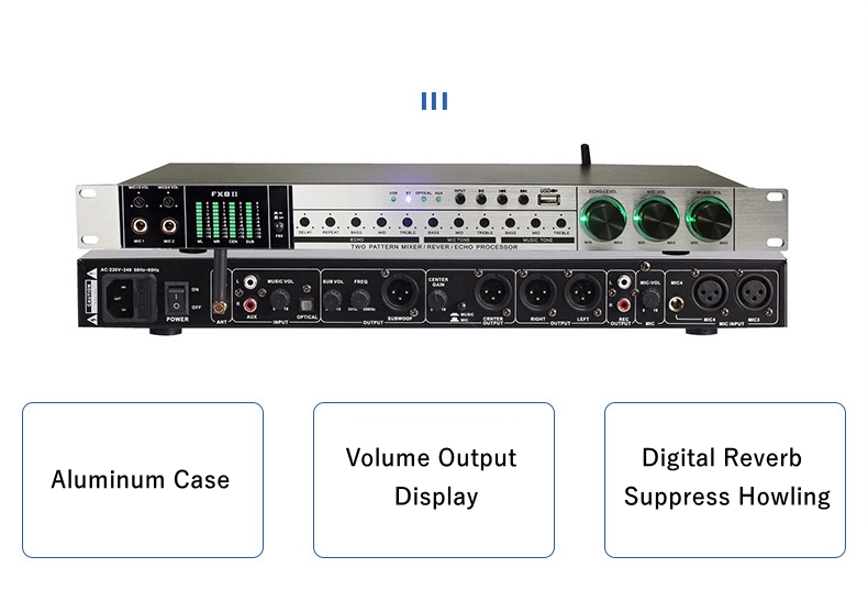 - The preamplifier is a karaoke effector with Bluetooth transmission and optical fiber digital audio transmission functions, and has USB playback function. A variety of transmission modes are integrated, and the transmission mode is switched by one button. The reverberation, music, microphone, treble, alto and bass pitch can be adjusted independently, and it is easy to operate.