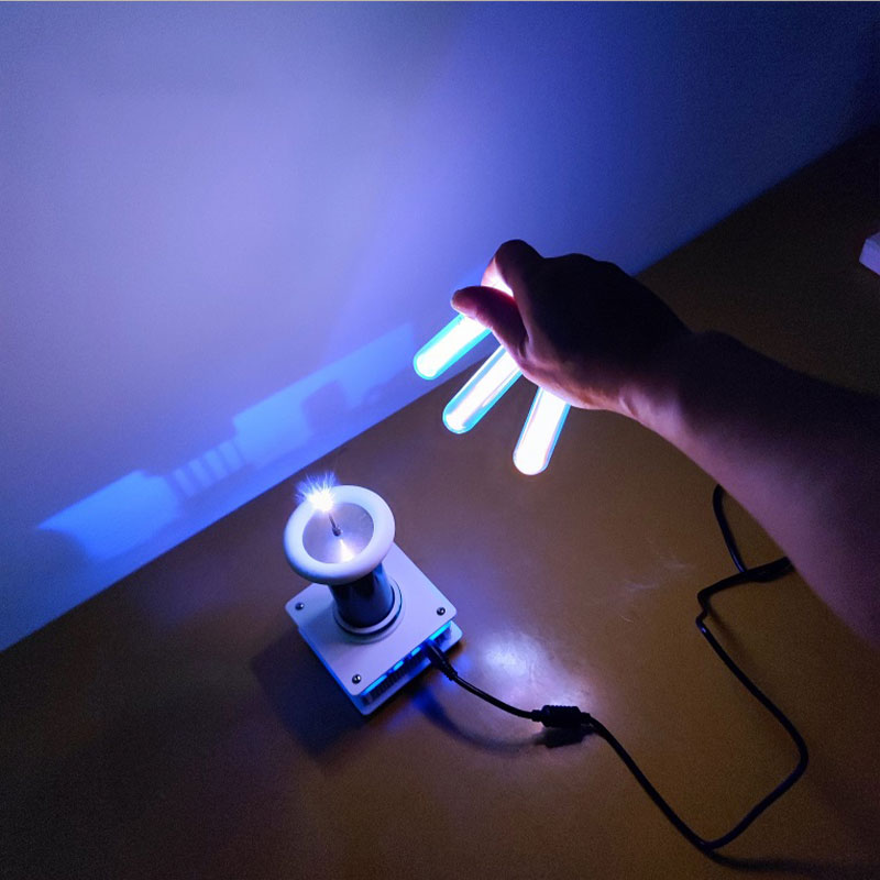 - Tesla coils can generate a high-frequency and high-voltage electromagnetic field. When some gas containing lamps approach, the gas inside the lamp will emit various lights under the action of the electromagnetic field. Common lamps include fluorescent lamps, incandescent lamps, neon lamps, disinfectant lamps, and some rare gas glass tubes. Different lighting fixtures have different effects, and due to the high power of our coil, the effect and distance of isolated lighting are currently the best on the market.