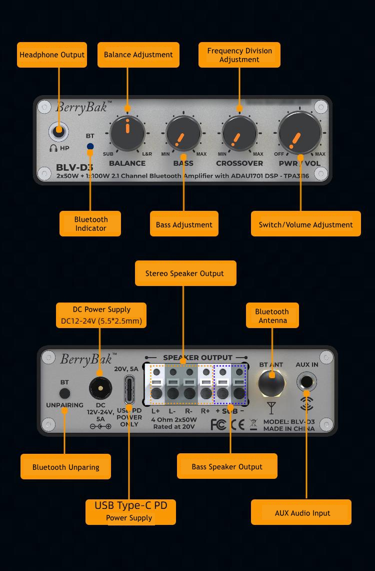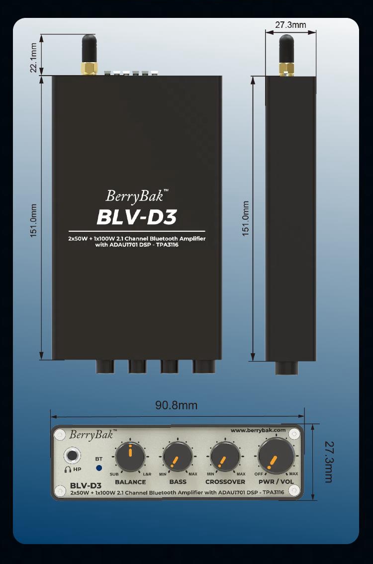BLV-D3 Portable 2x50W+100W 2.1Channel TPA3116 ADAU1701 Digital Bluetooth5.1 HiFi Power Amplifier