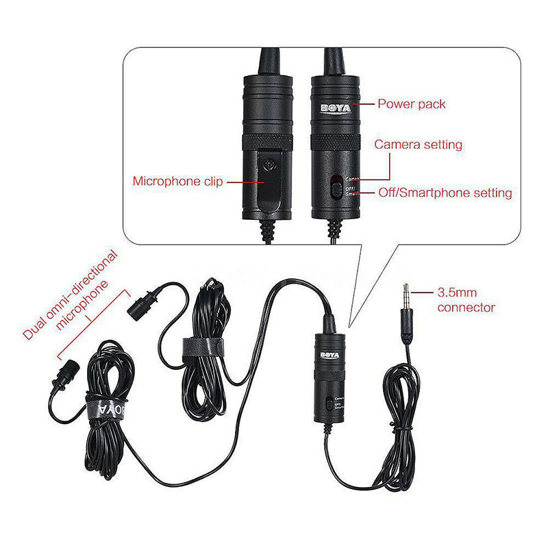 -The BOYA BY-MIDM is a dual lavalier universal microphone. With a single 1/8" stereo connector, it can be used with smartphones, DSLR camears, camcorders, audio recorders, PC and other recording devices.