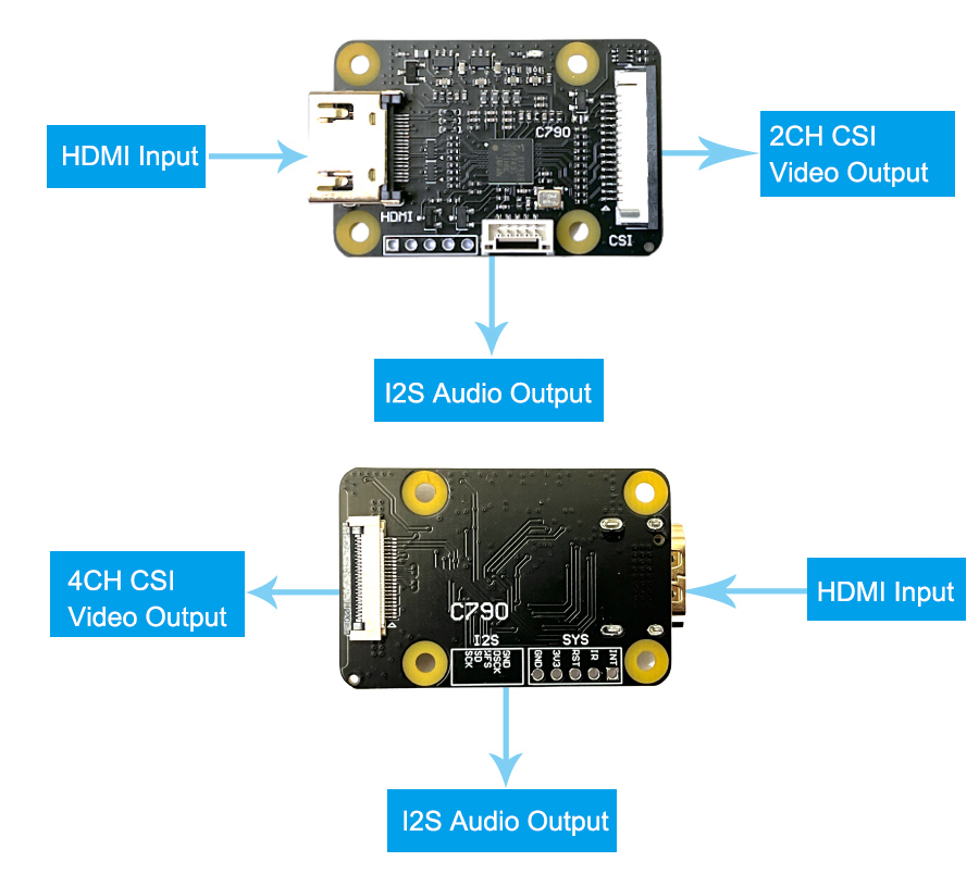 This module takes the incoming HDMI signal and converts it into a separate CSI signal and I2S audio signal. HDMI input supports up to 1080P 60Hz. It is suitable for Raspberry Pi, there are three versions of this module in history (C779, C780, and C790). C790 is the latest version. C790 has mitigate HDMI back-powering, also has two CSI channels and four CSI channels at the same time.
