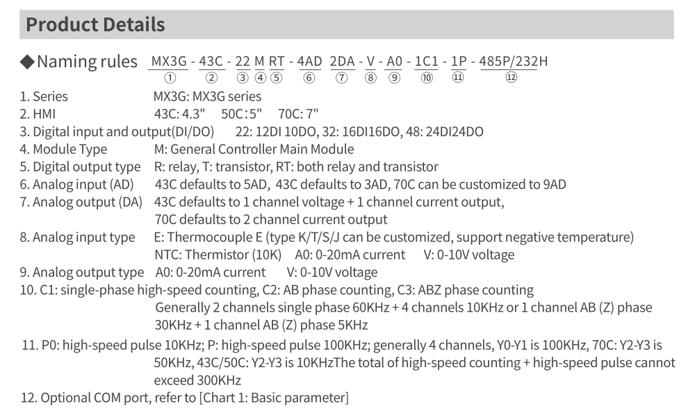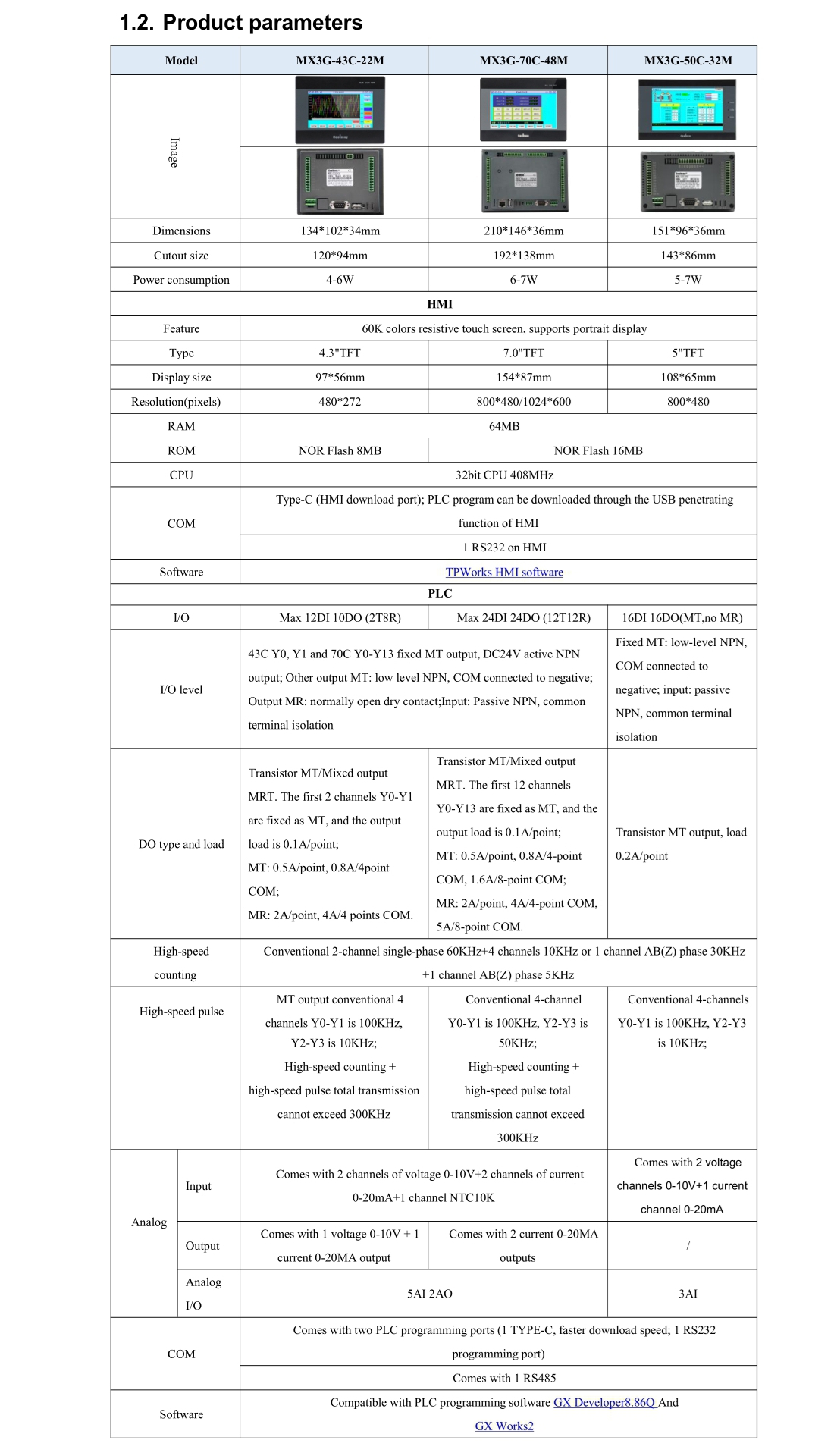 * The PLC of the MX3G-70C all-in-one unit includes 1 RS485 port, while the HMI includes 1 RS232 port (which can be switched to 1 RS485). The PLC of the MX3G-43C includes 1 RS485 port, while the HMI includes 1 RS232 port. These ports are used for connecting external HMIs, inverters, and other equipment.