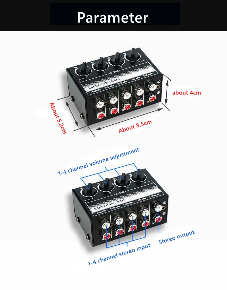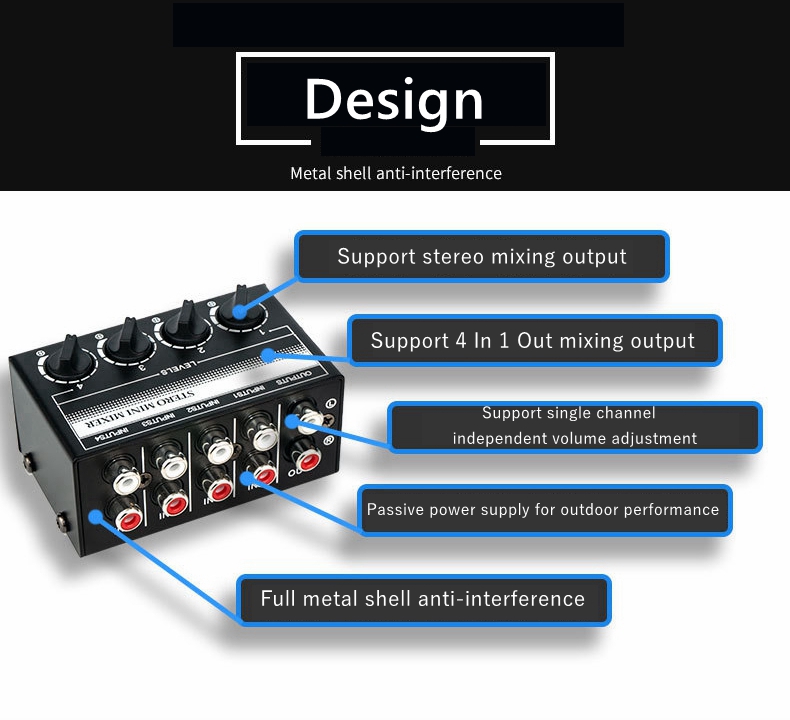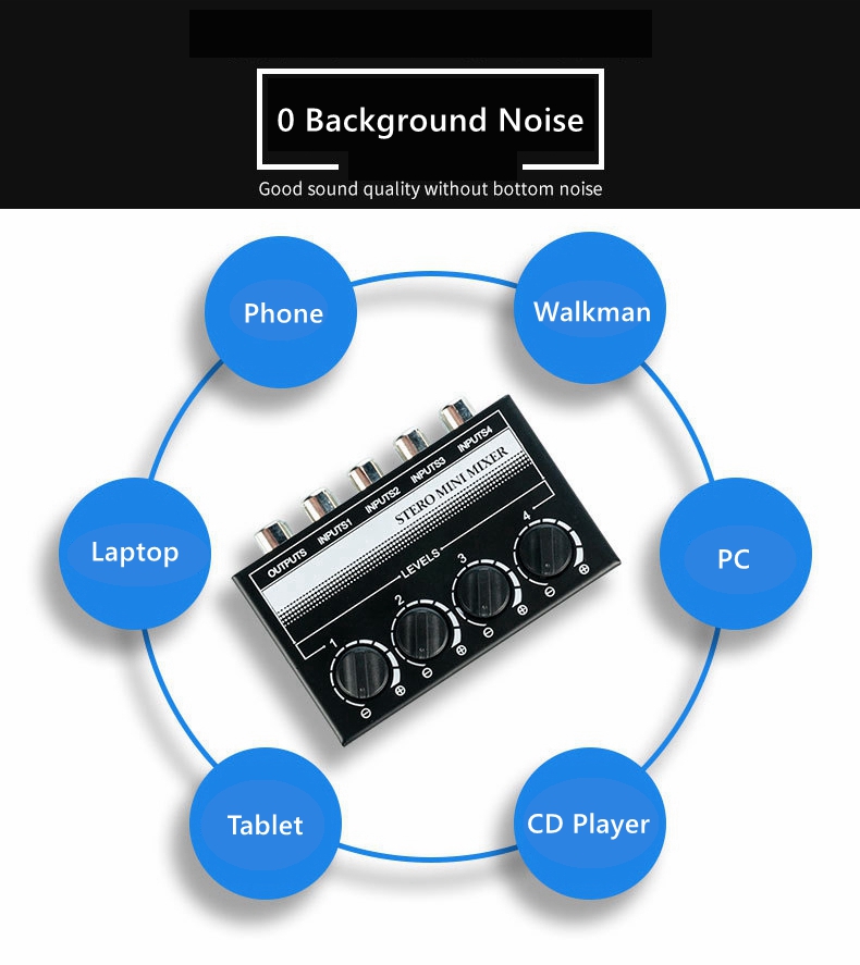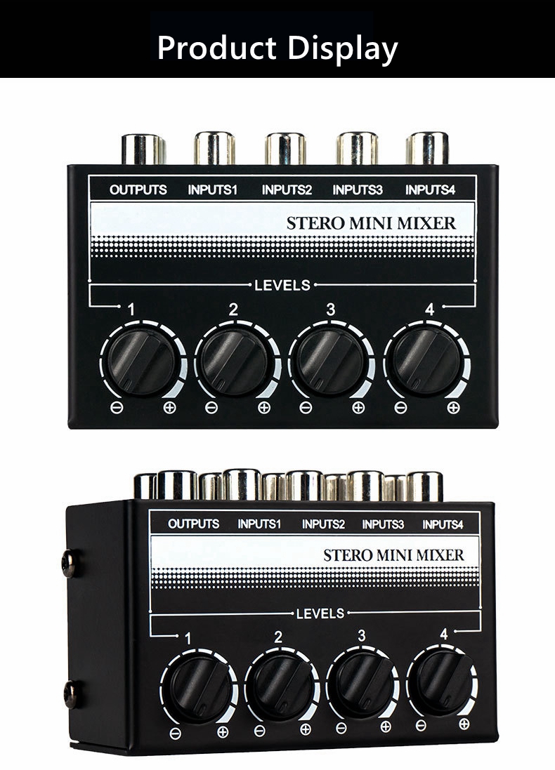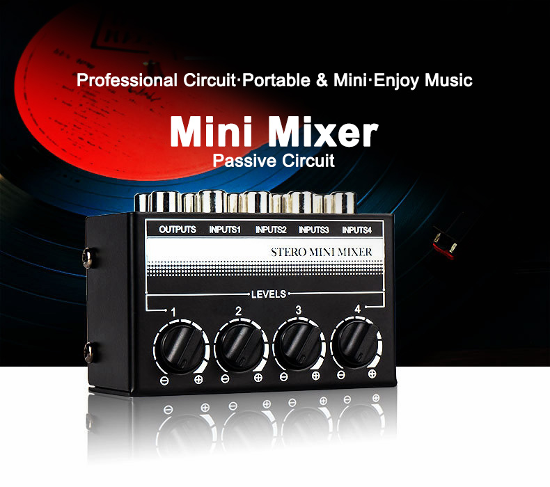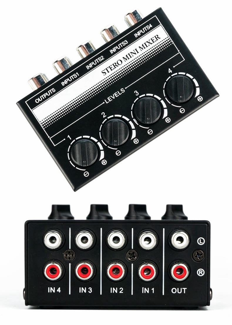 - The mini passive stereo mixer is a stereo four-way passive mixer, which is used to expand the control of tuning, mixing instruments, CD players, tape players, computers, mobile phones, tablets, etc. No battery or other power supply is required.