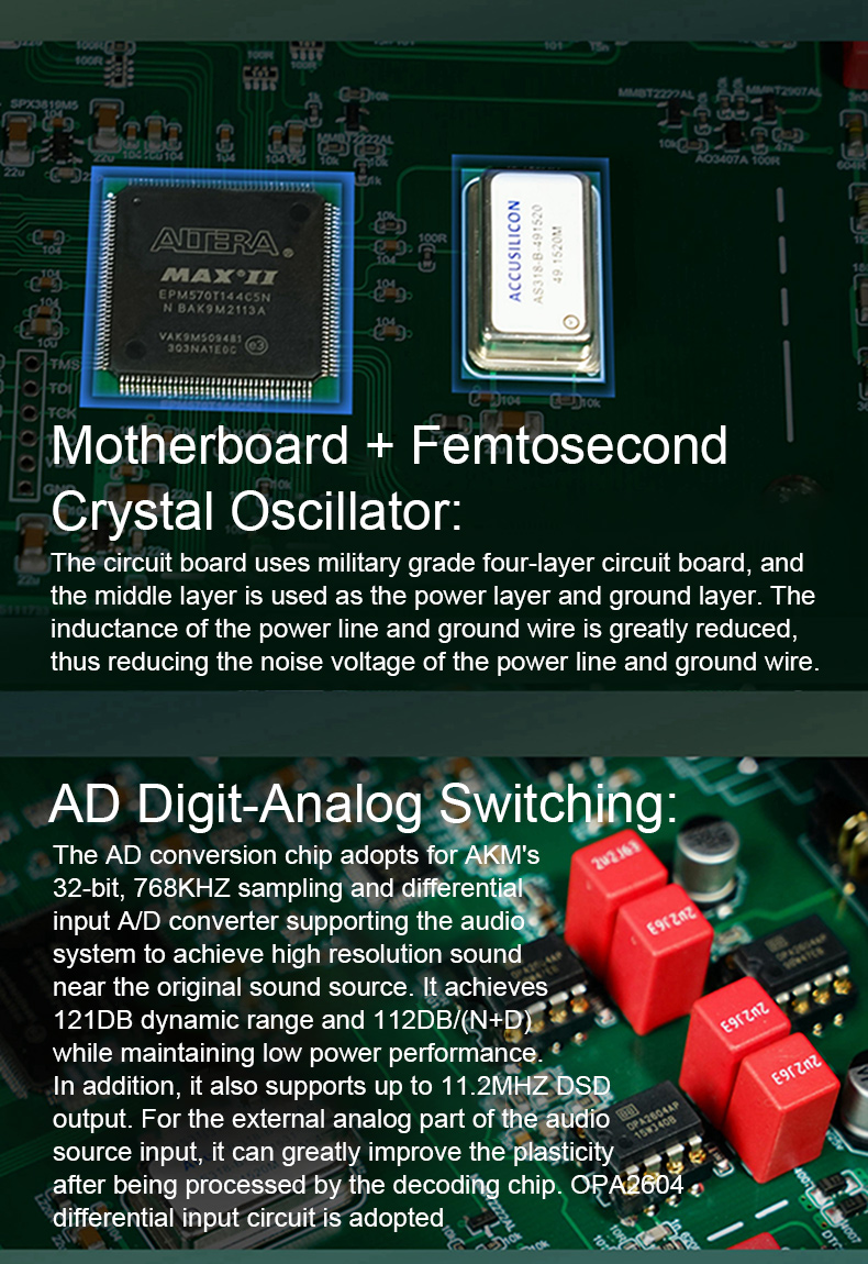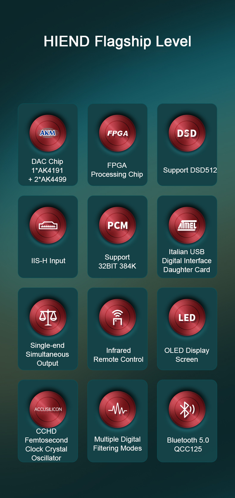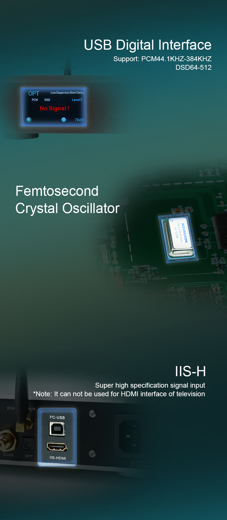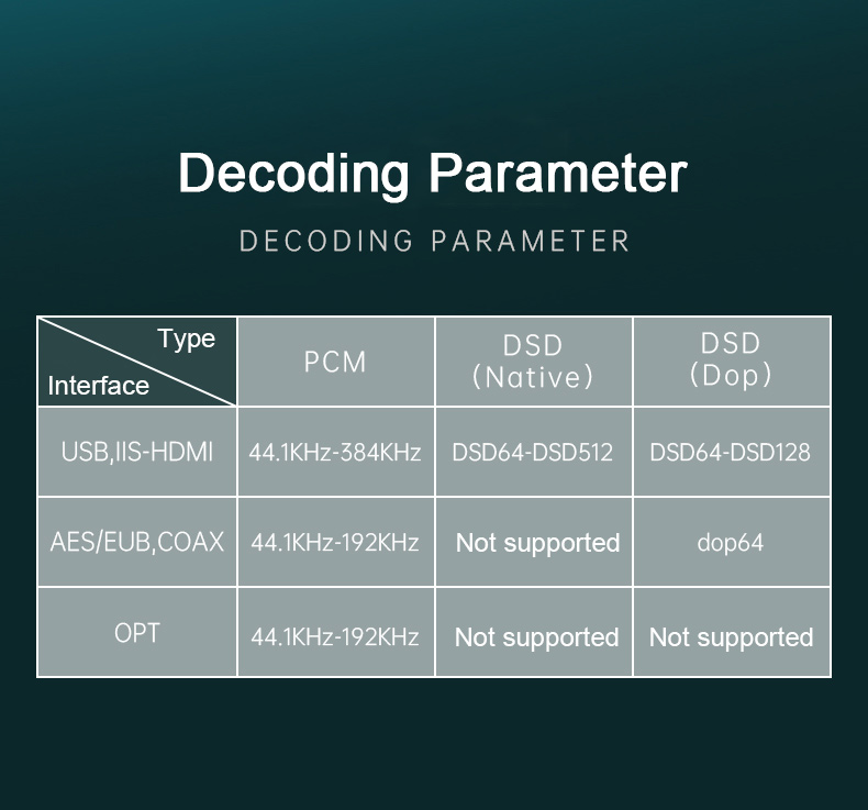 - PCM: 44.1KHZ 48KHZ, 88.2KHZ, 96KHZ, 176.4KHZ,192KHZ, 352.8KHZ, 384KHZ [Among them, USB and I2S support all sampling rates, and S/PDIF/OPT supports up to 192KHZ]