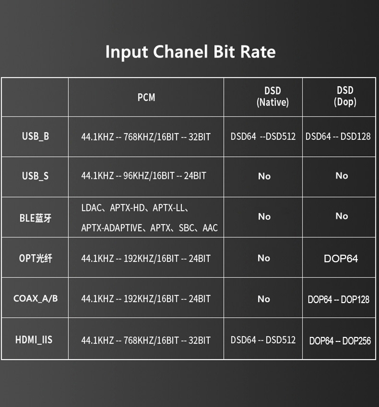 - Input interface: USB/OTG COAX x 2; OPT; HDMI_IIS; BLE Bluetooth