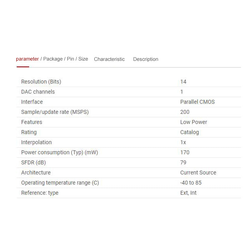 The DAC904 is a high-speed, Digital-to-Analog Converter (DAC) offering a 14-bit resolution option within the family of high-performance converters. Featuring pin compatibility among family members, the DAC908, DAC900, and DAC902 provide a component selection option to an 8-, 10-, and 12-bit resolution, respectively. All models within this family of DACs support update rates in excess of 165MSPS with excellent dynamic performance, and are especially suited to fulfill the demands of a variety of applications.