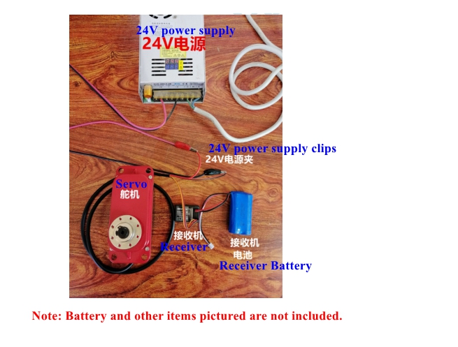 - In addition, you must prepare a separate 24V power supply to drive the servo. The red wire is the positive pole and the black wire is the negative pole. Please note that our servo can work with 12V-24V voltage, but the lower the voltage, the slower the speed and the smaller the torque. The marked torque value and speed value are both the value of 24V power supply.
