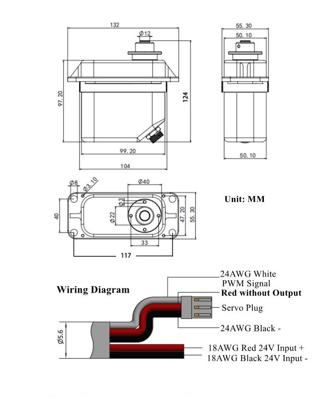 - Control method: PWM pulse width modulation signal, frequency 50HZ, period 20MS. Signal voltage: 3.3V-5V. (Pulse frequency: 50-333HZ)
