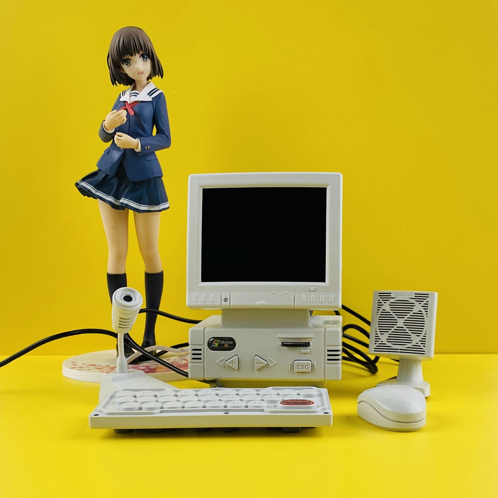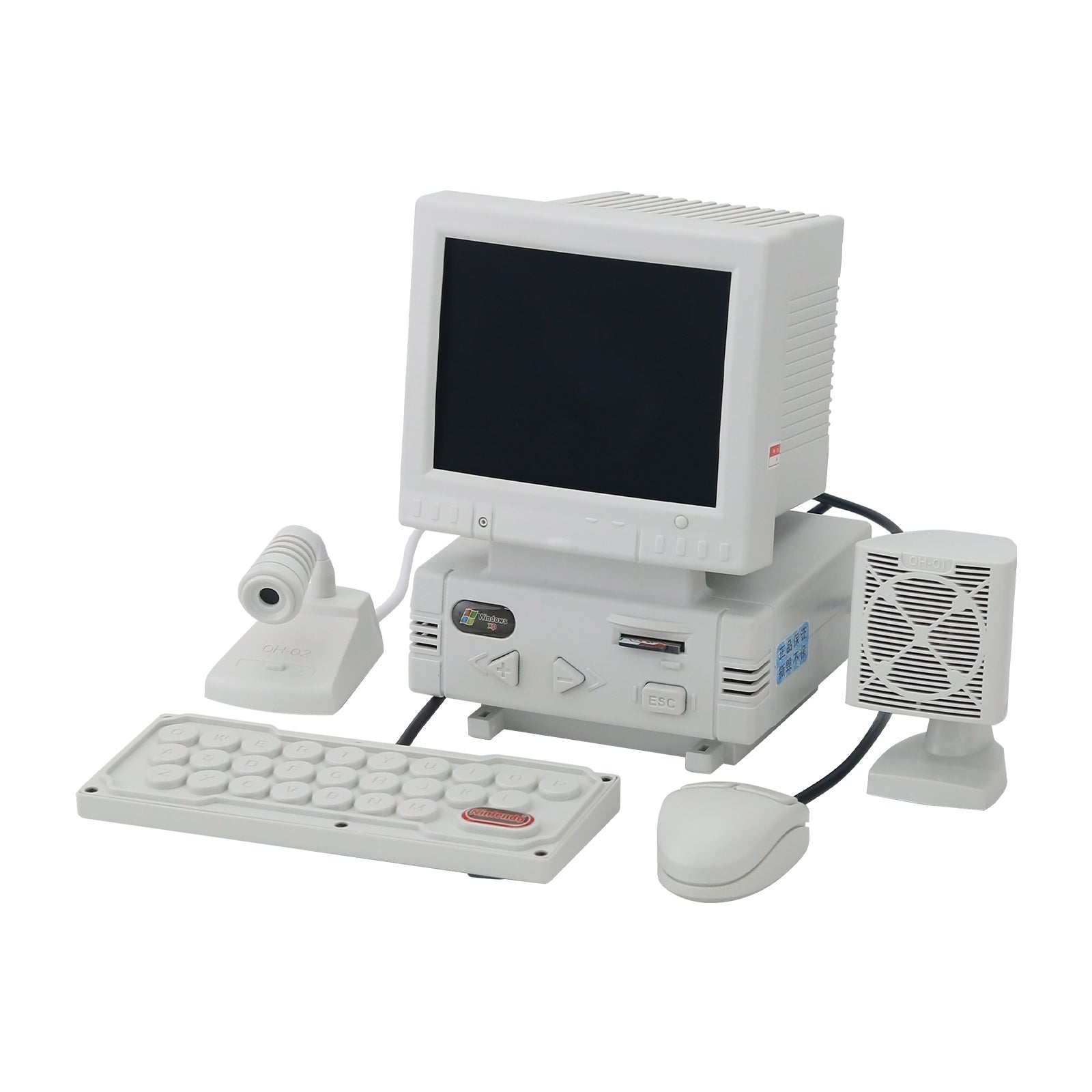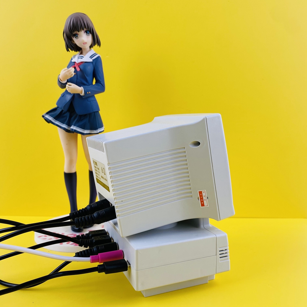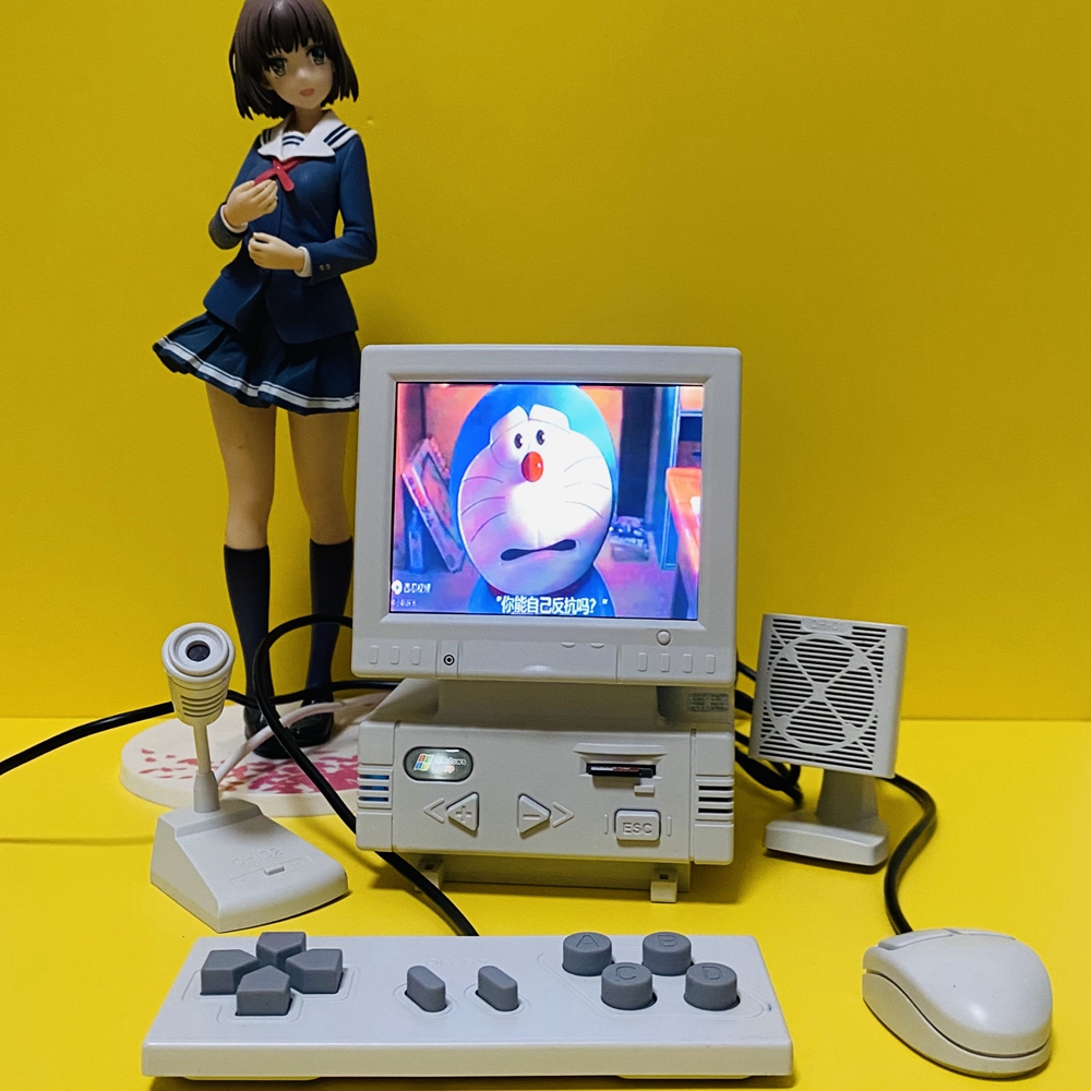 - DIY retro mini computer shaped game console (not a computer, unable to connect to the internet, WiFi, and Bluetooth). High definition 3.5-inch LCD display screen, body size: 87x85x128mm. Equipped with a mini mouse (the mouse can adjust the volume), keyboard (one side is virtual and the other is a game controller), noise canceling microphone (can karaoke when connected to a large TV at home), and desktop speakers.