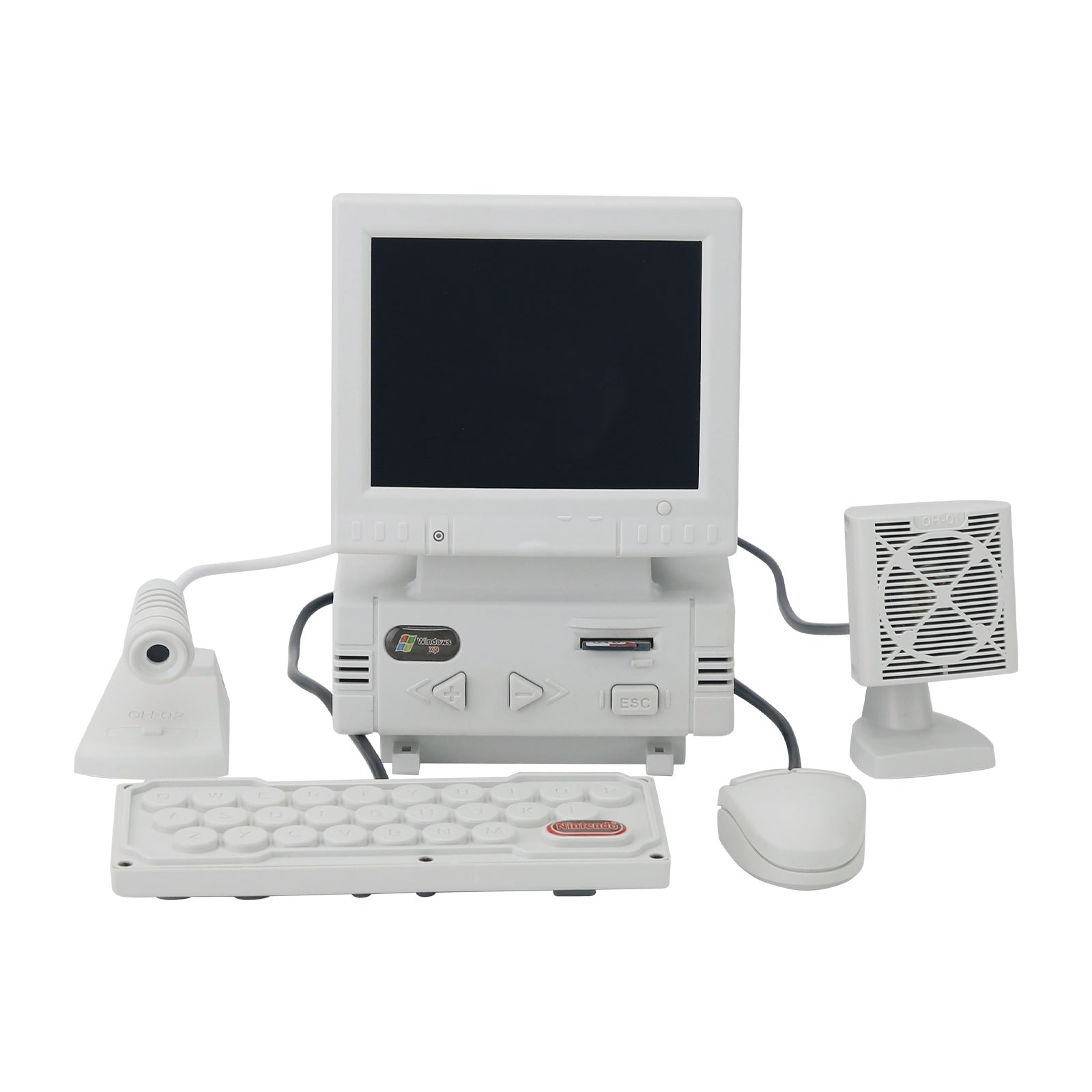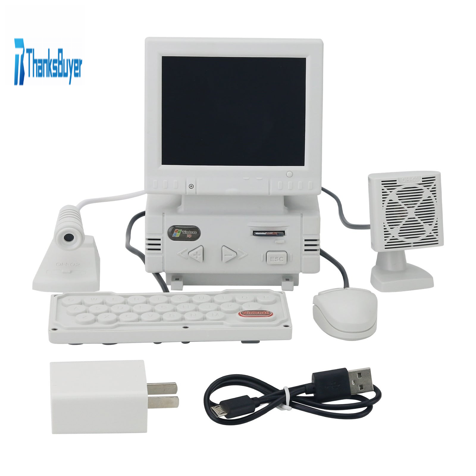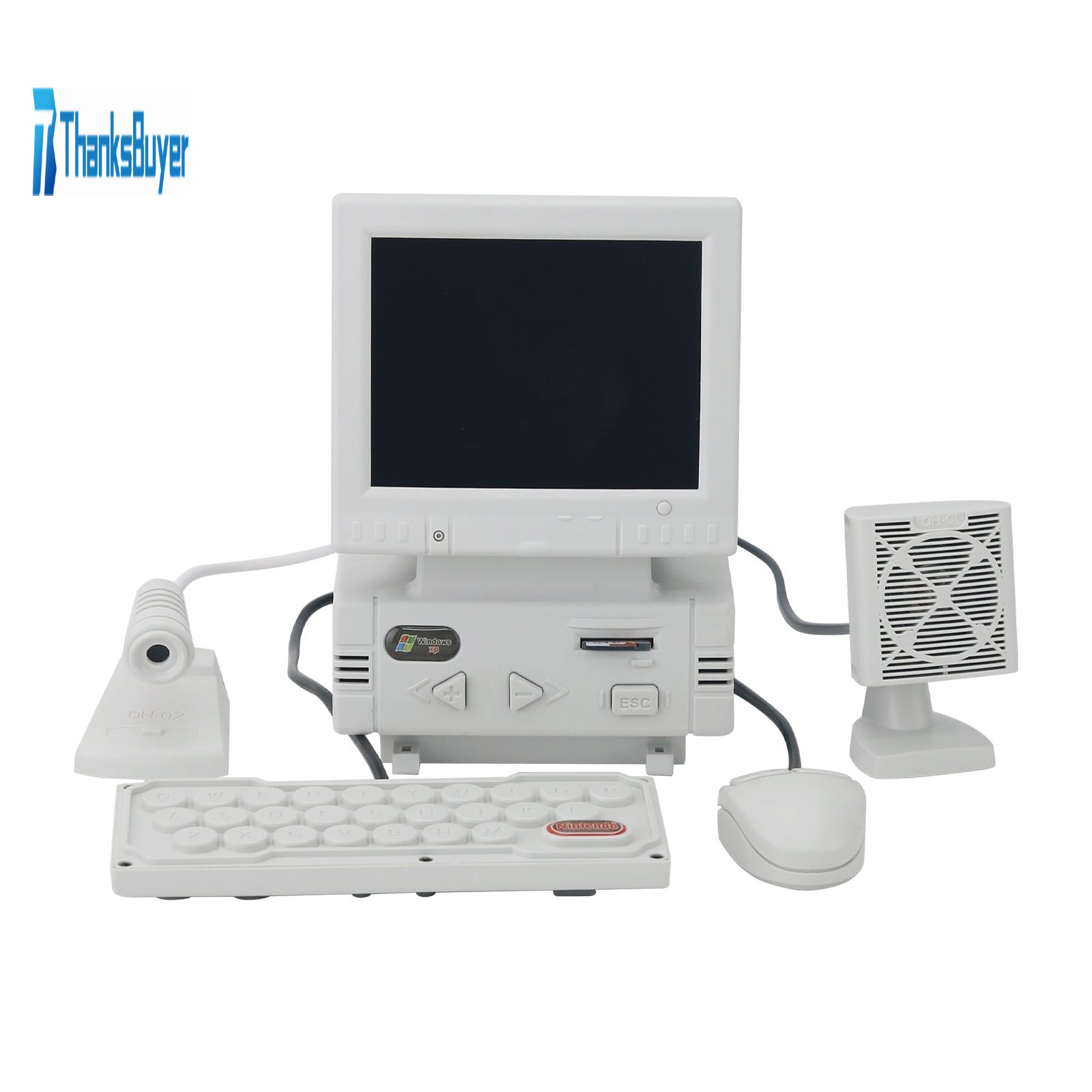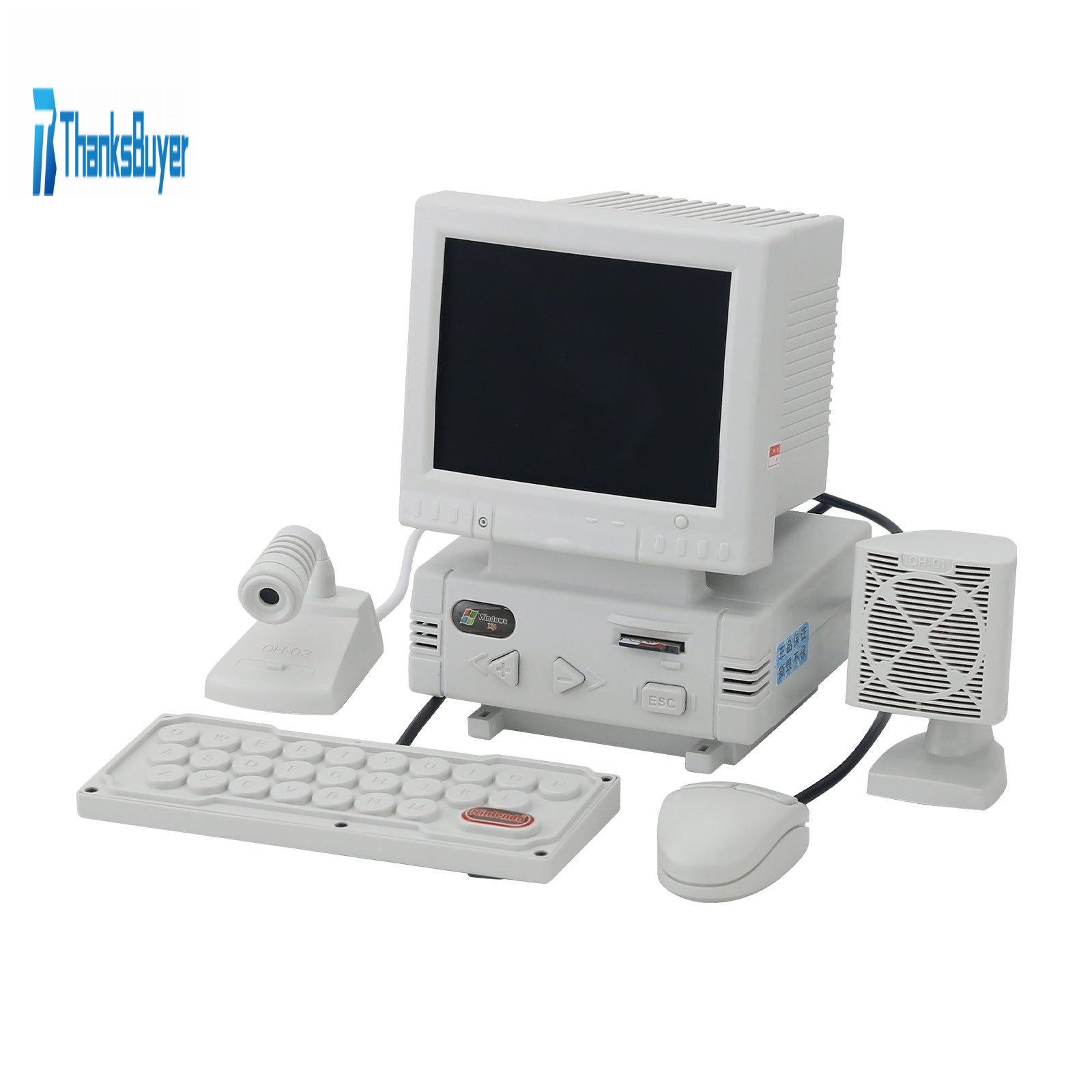- DIY retro mini computer shaped game console (not a computer, unable to connect to the internet, WiFi, and Bluetooth). High definition 3.5-inch LCD display screen, body size: 87x85x128mm. Equipped with a mini mouse (the mouse can adjust the volume), keyboard (one side is virtual and the other is a game controller), noise canceling microphone (can karaoke when connected to a large TV at home), and desktop speakers.