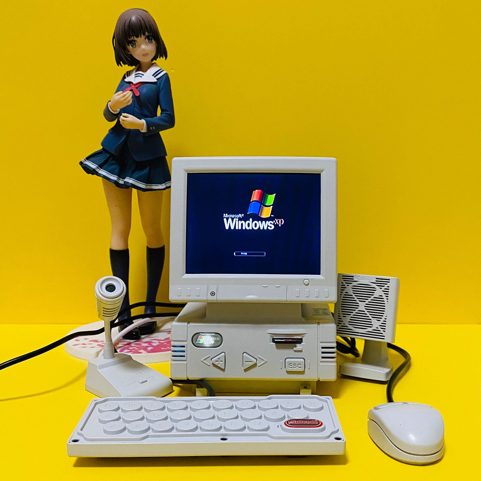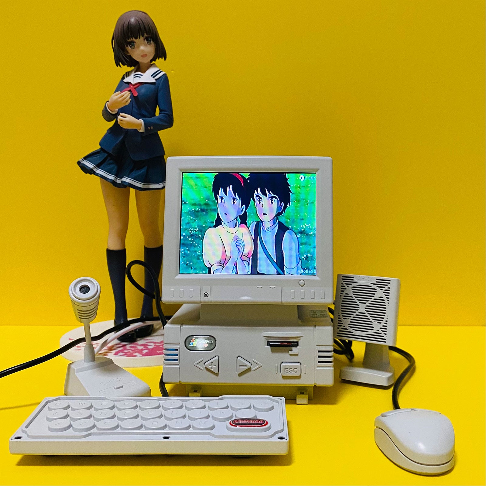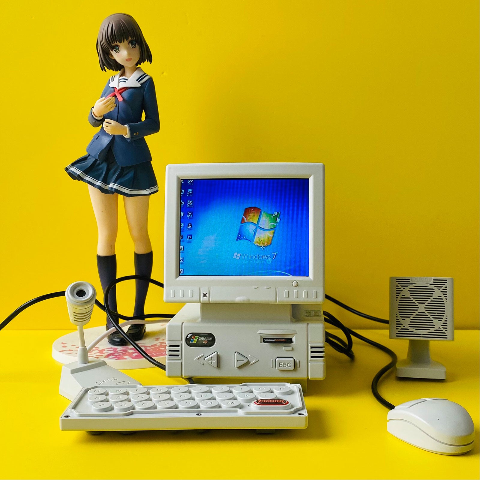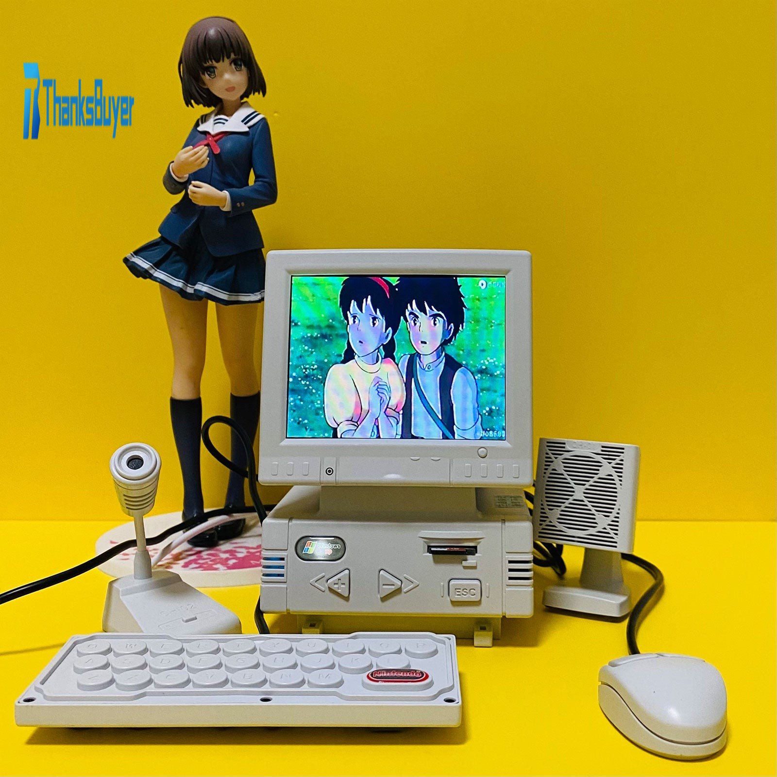 - DIY retro mini computer shaped game console (not a computer, unable to connect to the internet, WiFi, and Bluetooth). High definition 3.5-inch LCD display screen, body size: 87x85x128mm. Equipped with a mini mouse (the mouse can adjust the volume), keyboard (one side is virtual and the other is a game controller), noise canceling microphone (can karaoke when connected to a large TV at home), and desktop speakers.