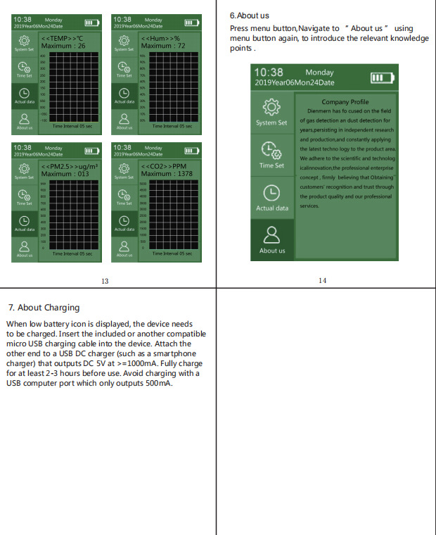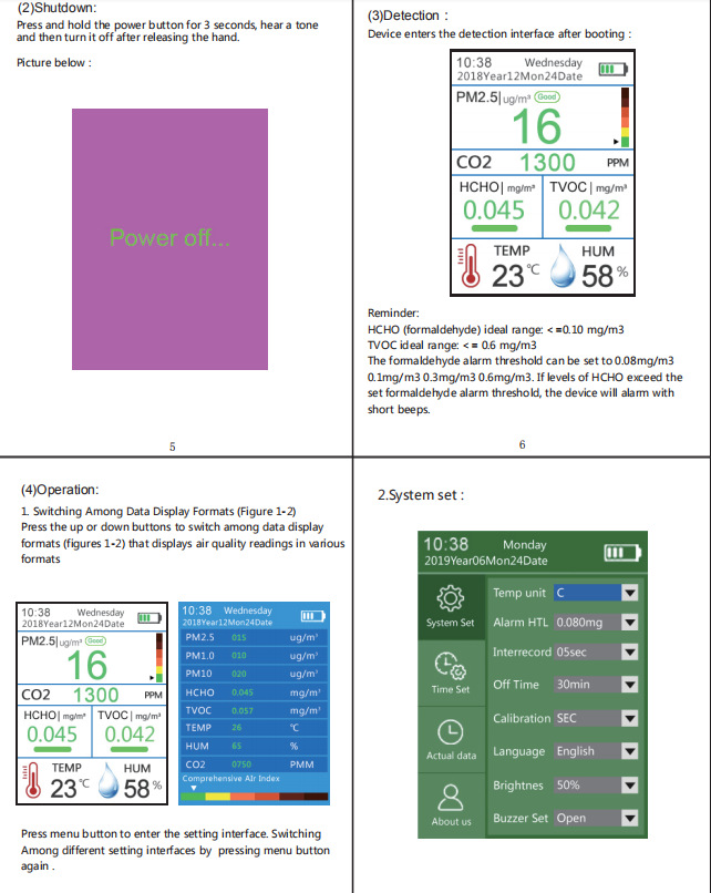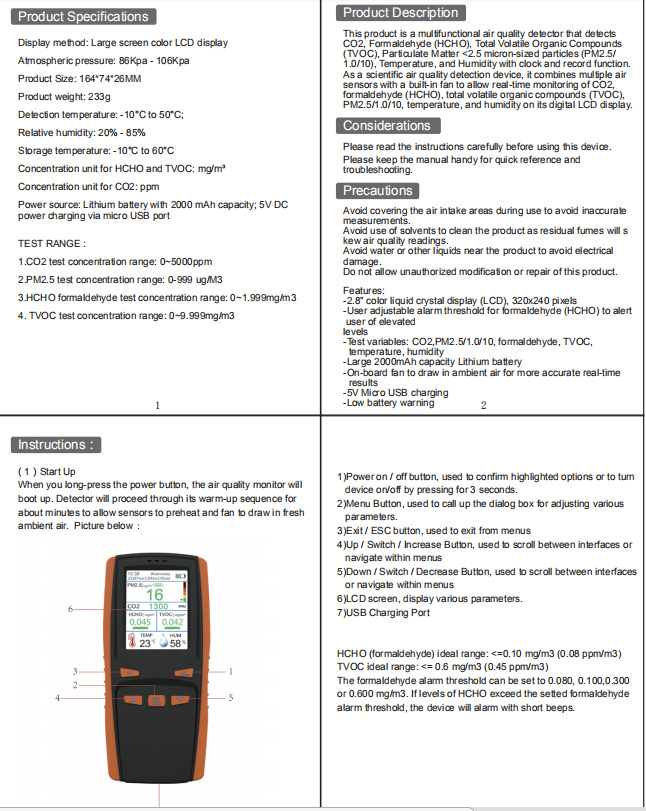- Detection range: AQI (0-500); PM2.5 (0-999ug/M³); CO2 (0-5000ppm); HCHO (0.001-1.999Mg/M³); TVOC (0.001-9.999Mg/M³)