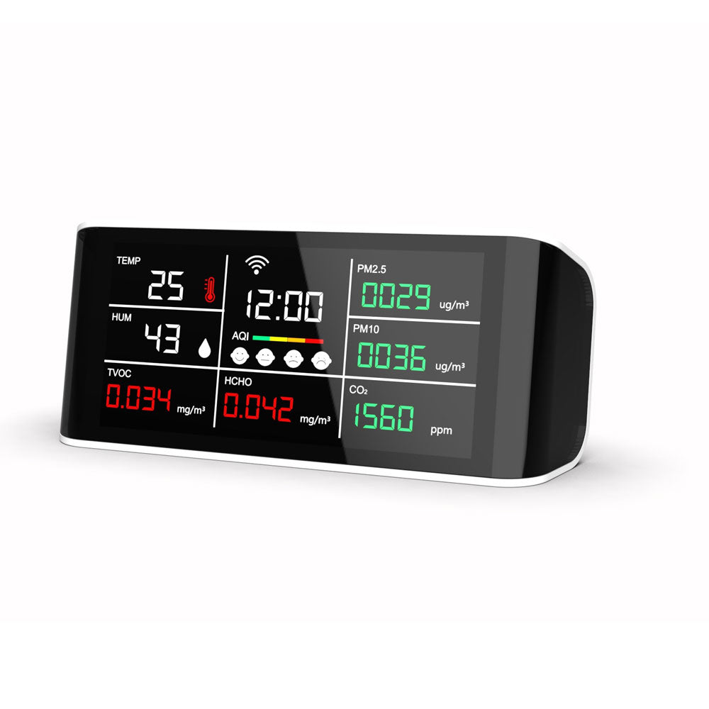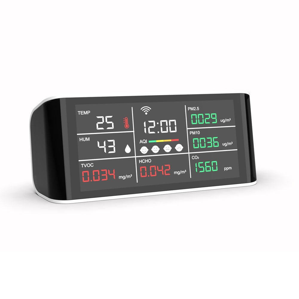 DM69D-WIFI is an advanced 9-in-1 multifunctional air quality monitor. It can detect carbon dioxide (CO2), particulate matter (PM2.5/PM10), formaldehyde (HCHO), total volatile organic compounds (TVOC), air quality index (AQI), temperature, and humidity with a time function.