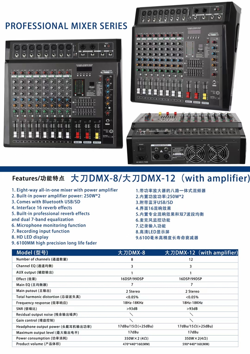 DMX-8 8-Channel Professional Audio Mixer 2x250W High Power Audio Console with Bluetooth Reverberation and Equalization