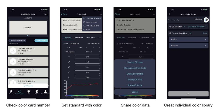 • Users can create personal colour databases and enter information on colour cards for printing, paint and textiles. The colour libraries created can be uploaded to the cloud for easy colour processing with data sharing across multiple devices.