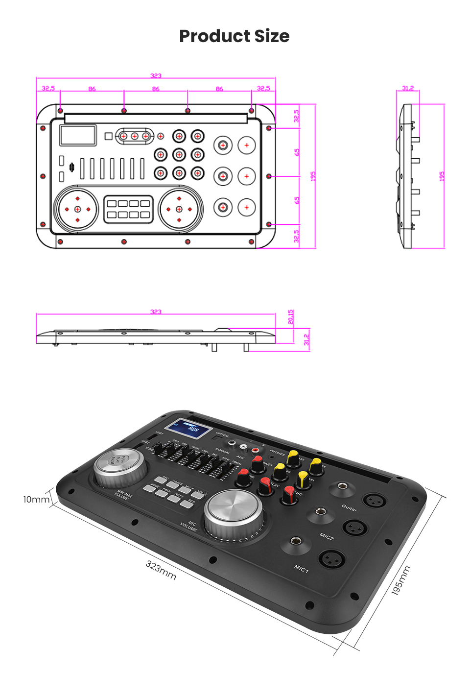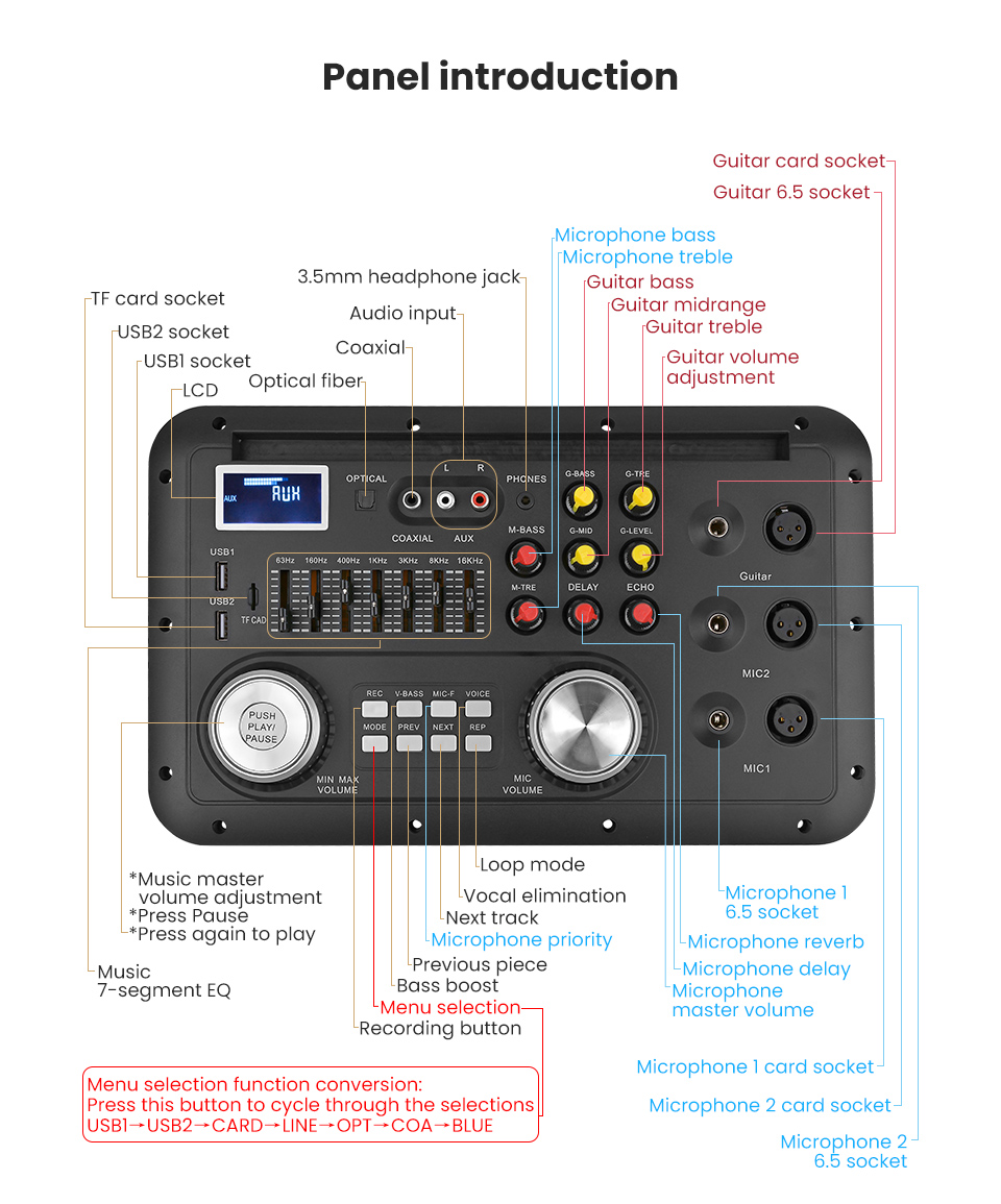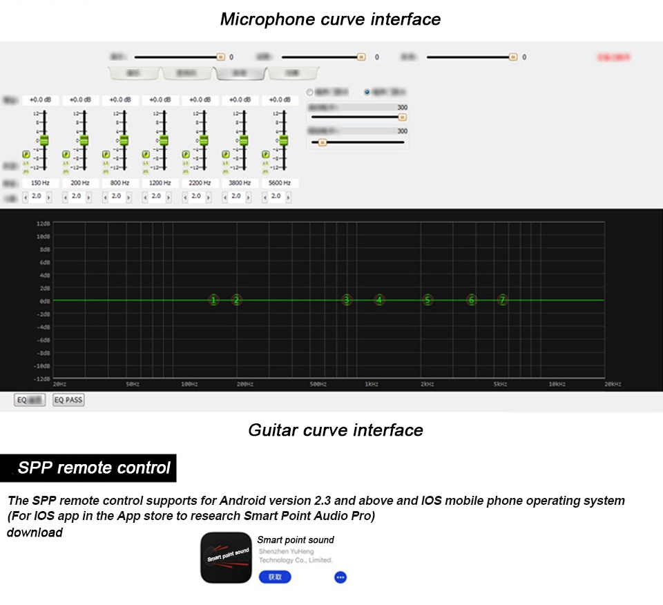 20. Music 7-segment EQ, microphone treble and bass adjustment (APP adjustable 5-segment EQ), guitar treble, mid and bass adjustment (APP adjustable 7-segment EQ), microphone adjustable delay and reverb, microphone and guitar independent volume adjustment.