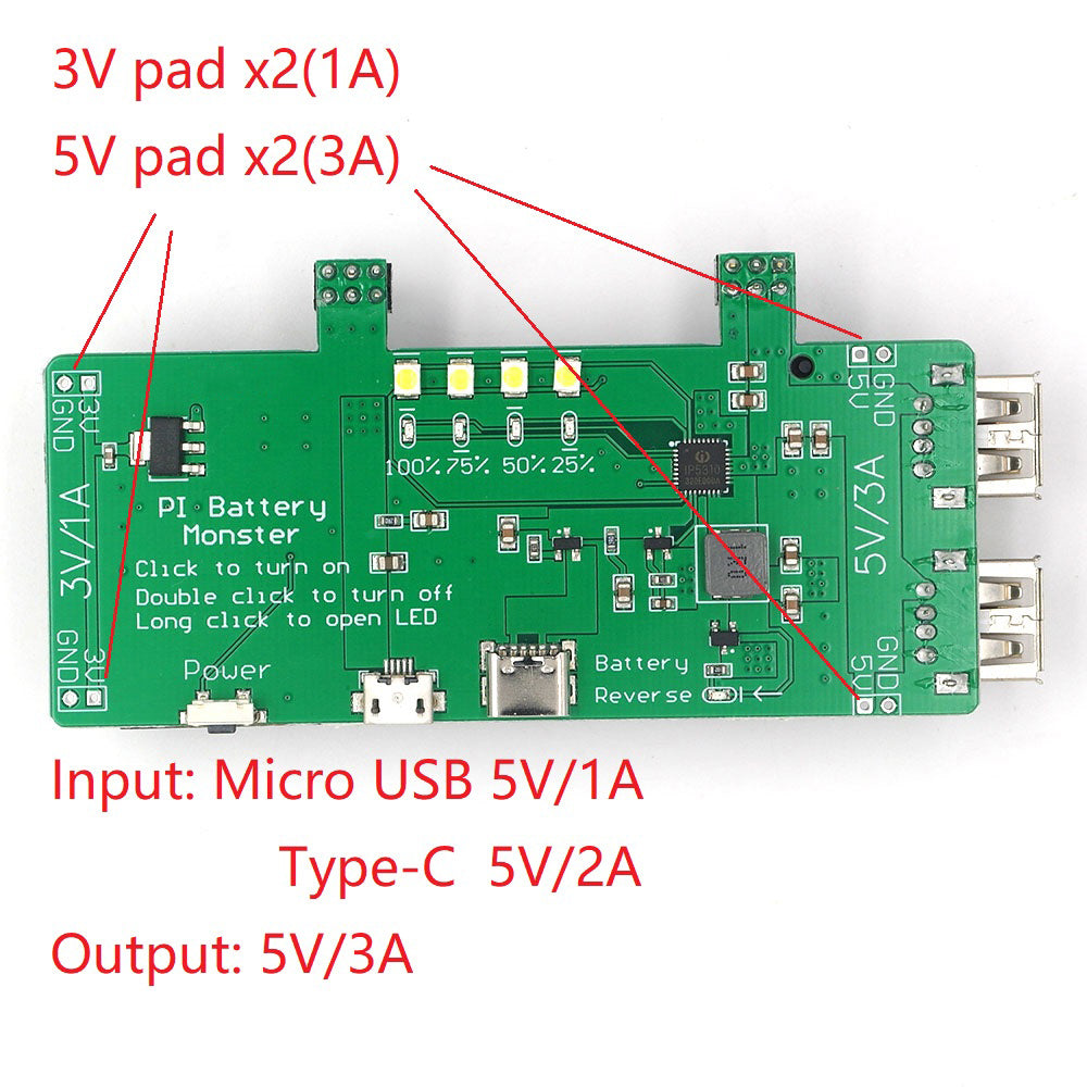 - 5V/2P pad x2(5V/3A),3V/2P pad x2(5V/1A)