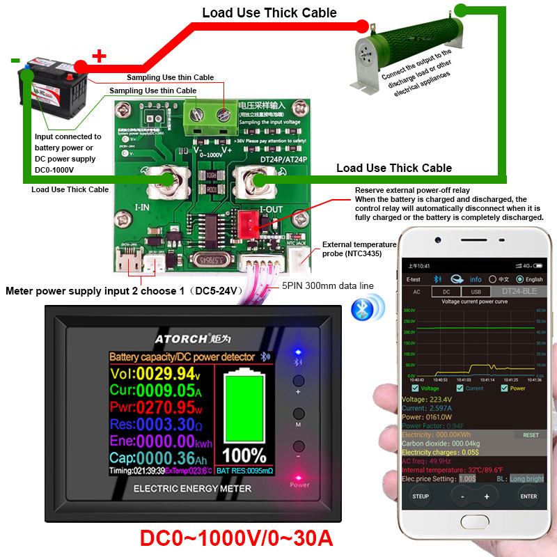 1000V 30A 30000W Bluetooth digital battery/DC power supply detector.