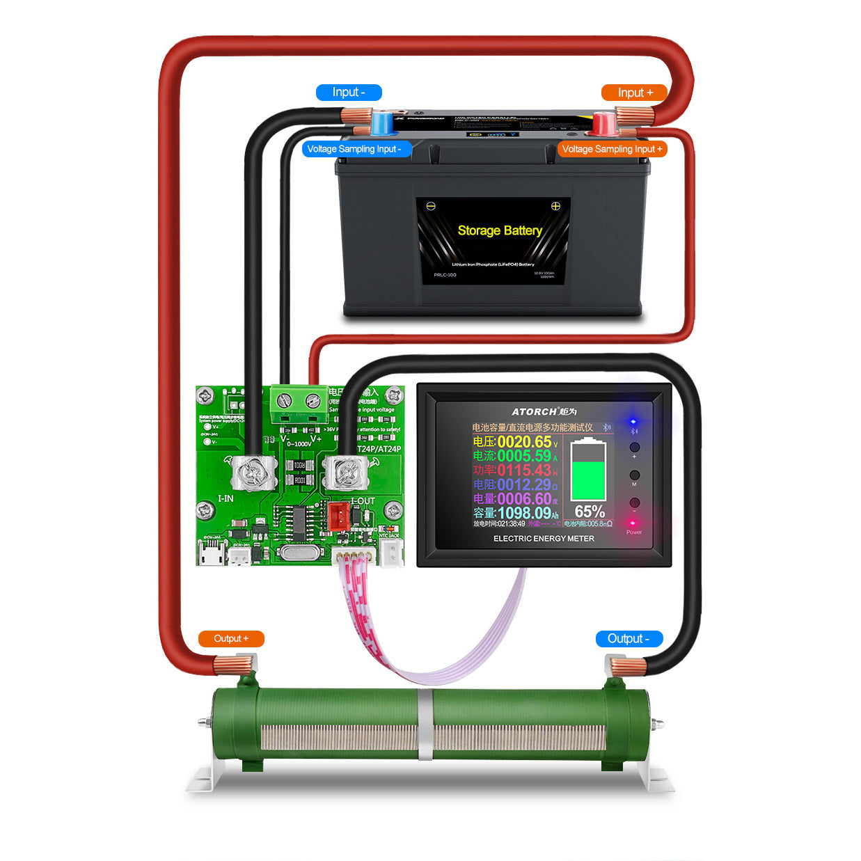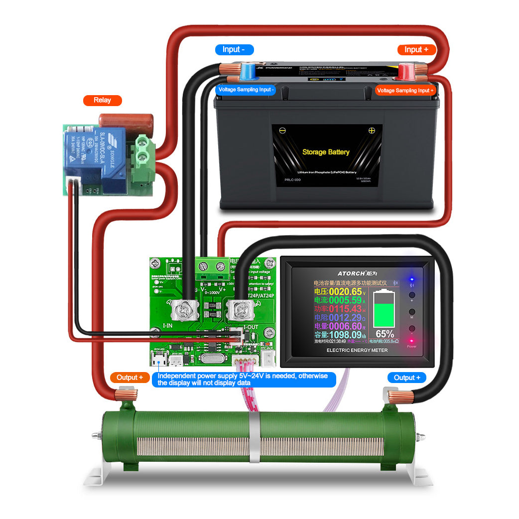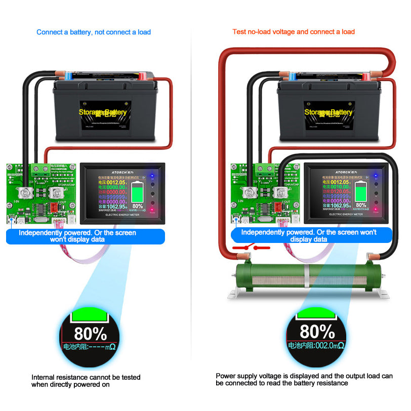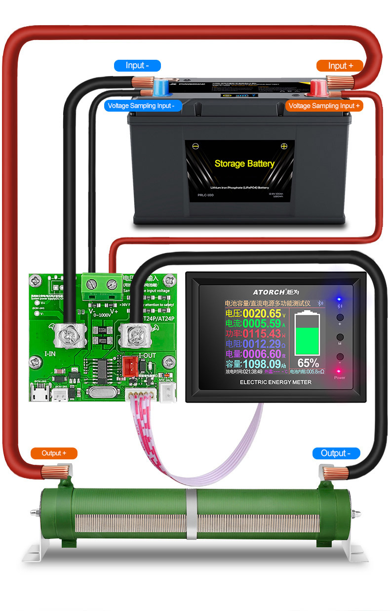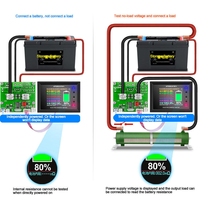 According to the connection method shown in the figure below, first measure the current no-load voltage of a battery, and then add the output load. At this time, the internal resistance parameters of the current battery can be read. The internal resistance calculation formula of this table: (no-load voltage - with-load voltage)/current = battery internal resistance.