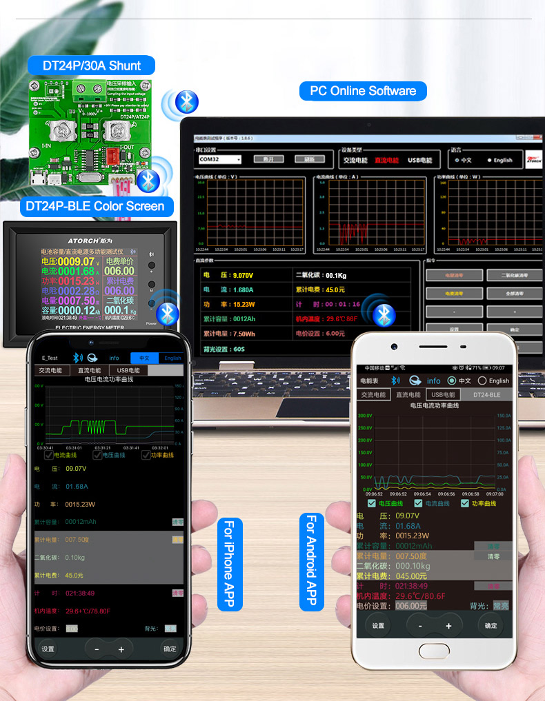 Support 3 major upper computer online system APP software, support for Android, Apple, PC computer Bluetooth wireless connection. All kinds of measurement parameters are available, suitable for multiple measurement applications, one machine with multiple uses.