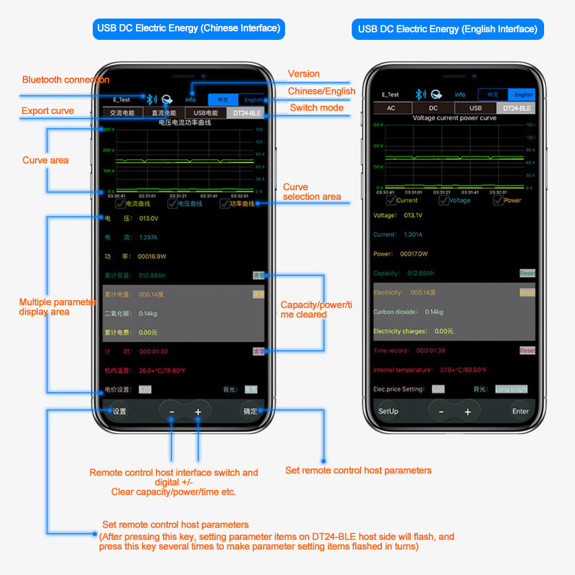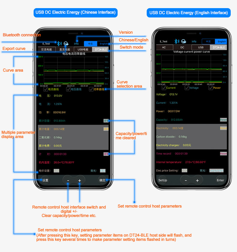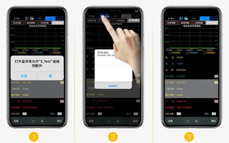 1.For iPhone Mobile Phones: Please download and install E_test directly in app store, then click Bluetooth APP icon to open the software, click Bluetooth icon at the top of the software to enter and select DT24-BLE to connect, and you can realize the mobile phone wireless remote control setting and measurement. Discharge status can be checked at any time on your mobile phone, and various data are clearly visible, such as discharge voltage, current, and power curve.