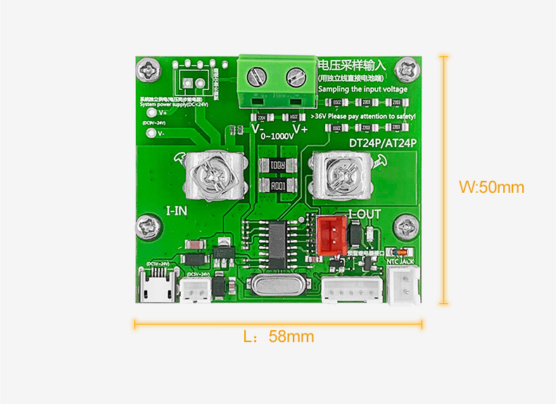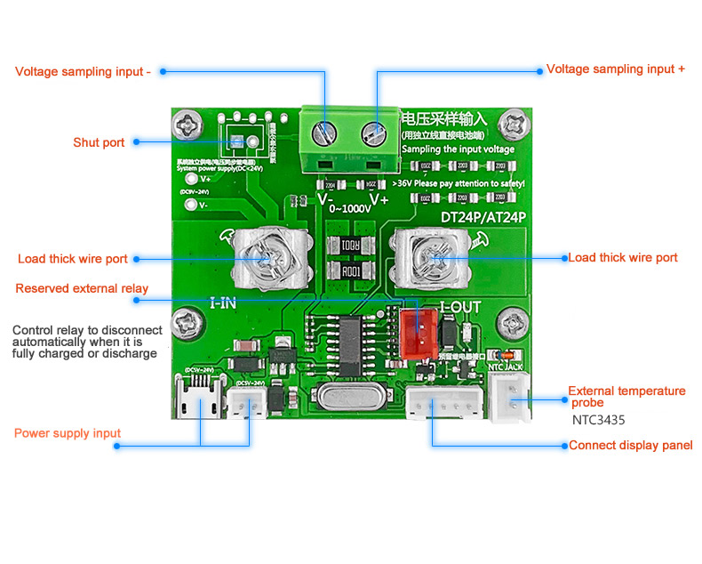 4-wire sampling connection, can set high-voltage, low-voltage, over-power upper limit, lower limit triple alarm, measure the internal resistance of the battery, external independent shunt board. The all-plastic shell of the control board ensures safety when using 1000V electricity.