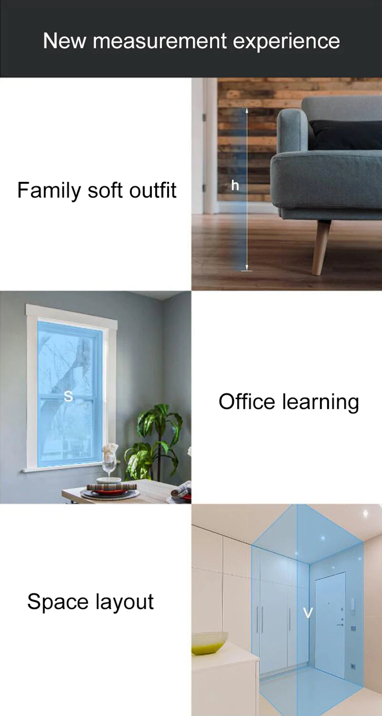 - Multiple practical functions includes straight line measurement, continuous measurement, area measurement, volume measurement, level measurement, primary Pythagorean, secondary Pythagorean, one-key angle measurement