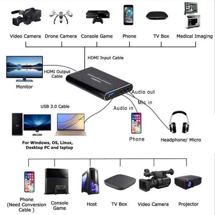 With USB3.0 HD game acquisition box, you only need to connect to your computer (only for Windows, Mac, Linux systems), no need to install drivers, and then use third-party software to collect or stream HD game videos or other HD video sources.