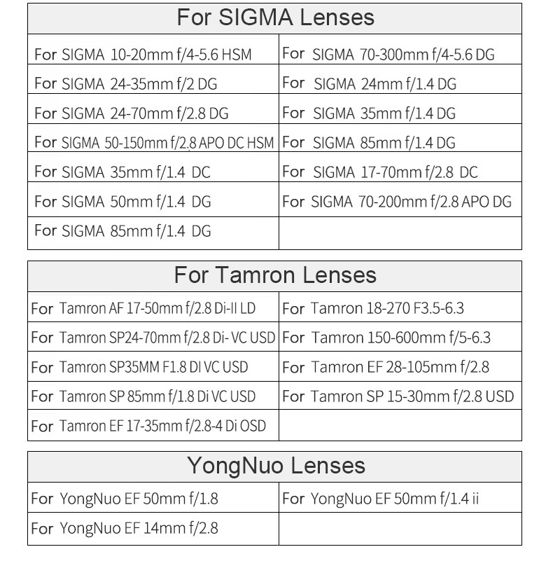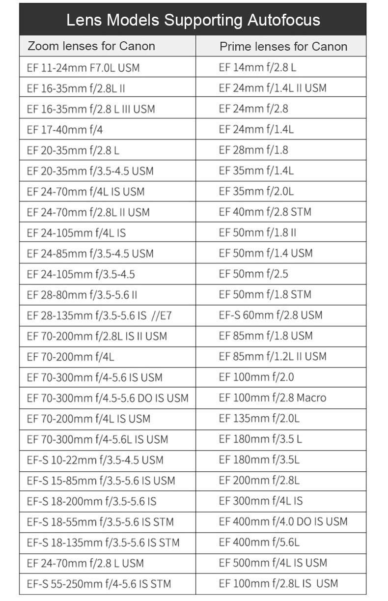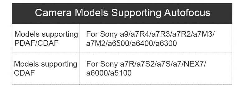 The following are lists of camera models and lens models that we have tested so far that support autofocus. Please check your own camera model and lens model when purchasing. If your camera model and lens model are not listed, it doesn't mean that your devices don't support autofocus. Models that are not listed here haven't tested by us.