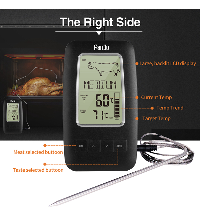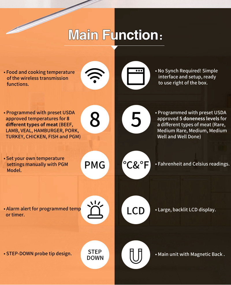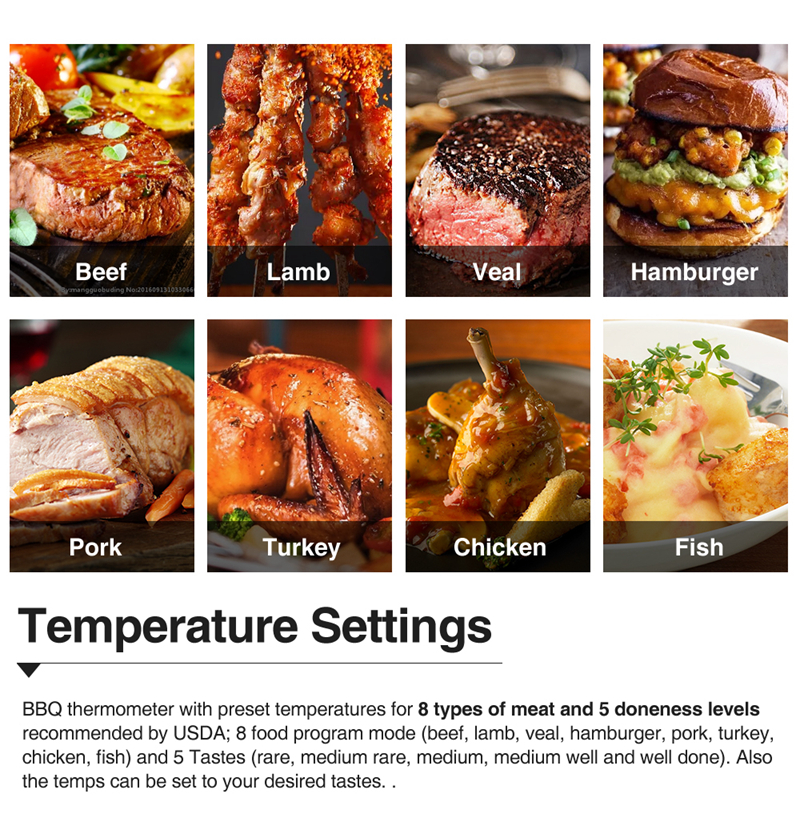 - 8 kinds of food built-in temperature options (BEEF, VEAL, LAMB, CHICKEN, TURKEY, PORK, FISH, HAMBRGER and 1 custom temperature setting (PGM)