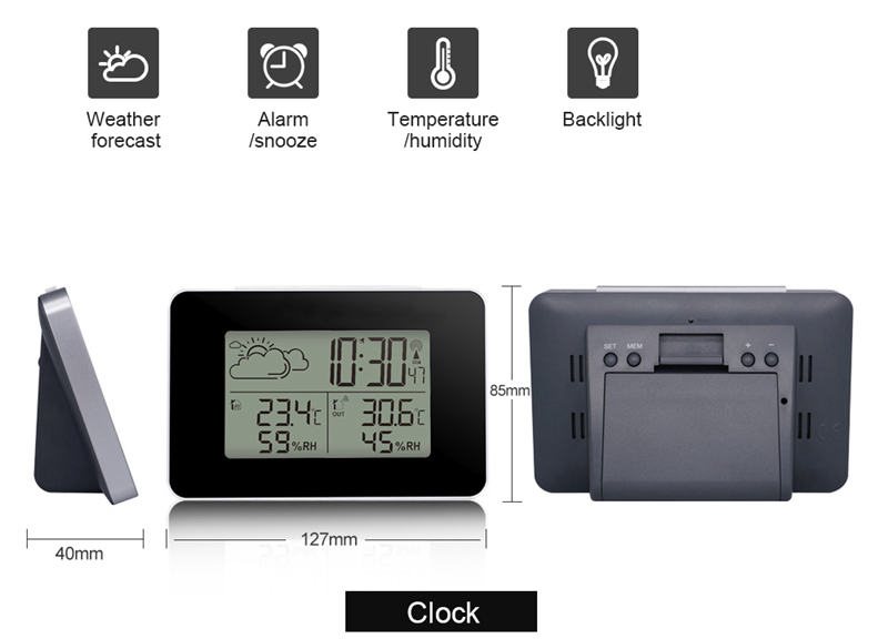FanJu FJ3364 Weather Clock Electronic Alarm Clock For Indoor Outdoor Temperature Humidity Black